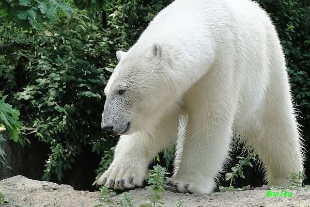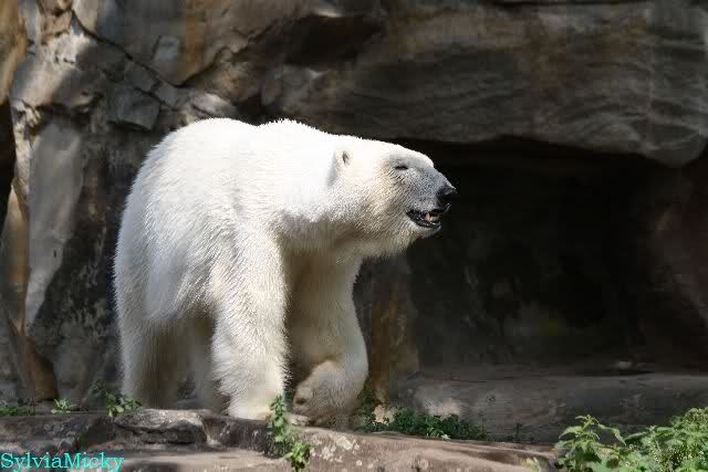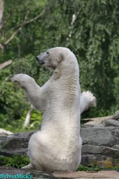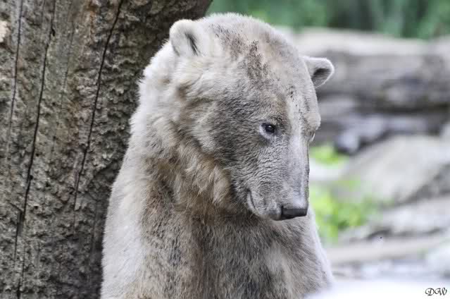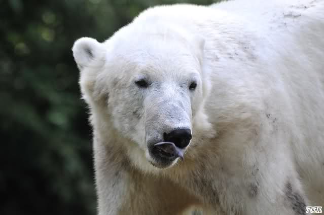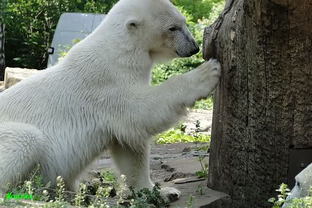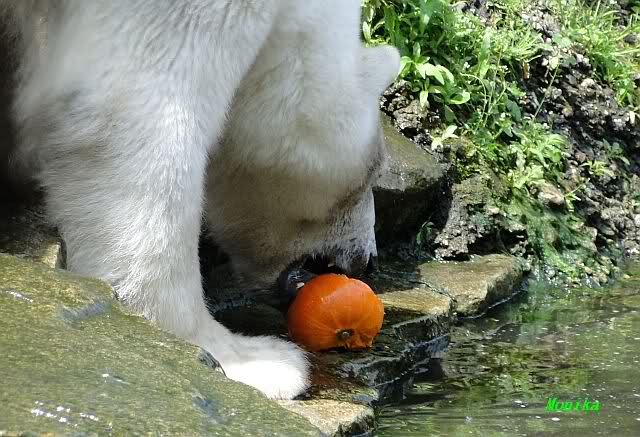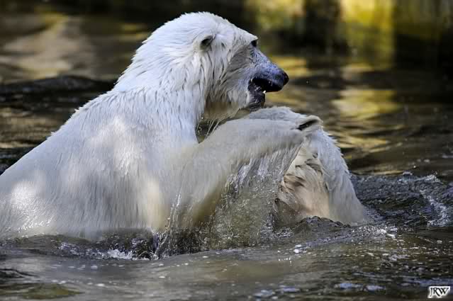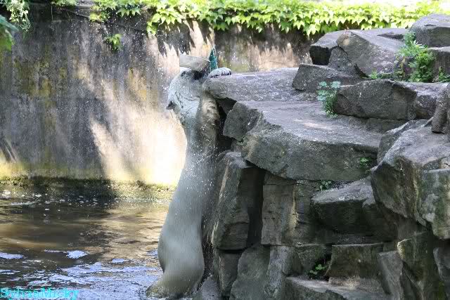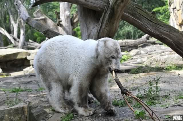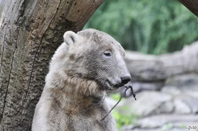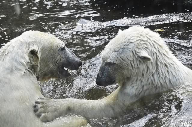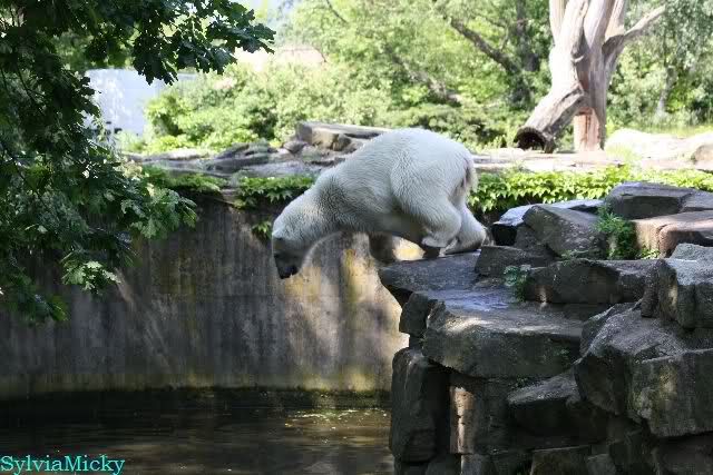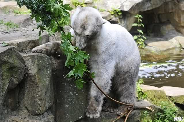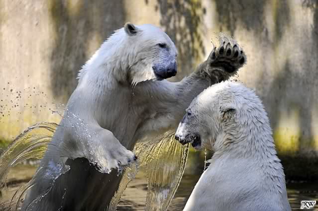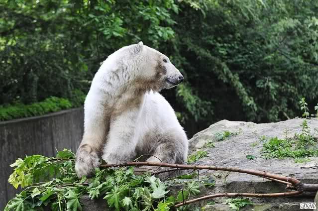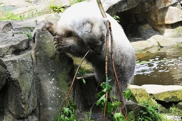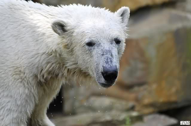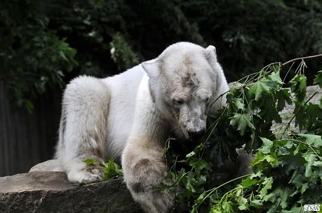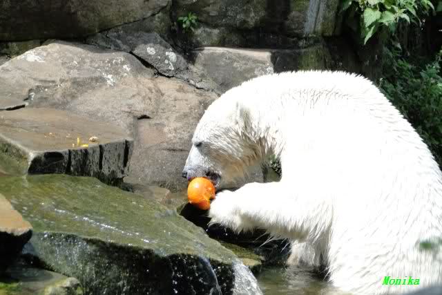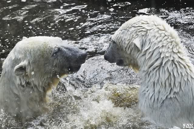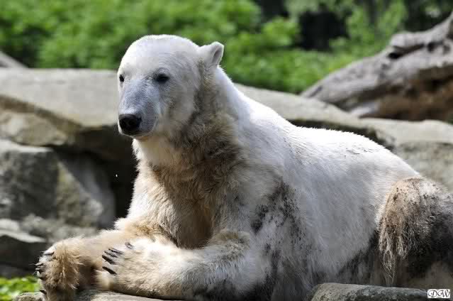 Monika, tolles Bild von Bumi in Knut's Arm. Natürlich habt Ihr Unrecht mit den weißen Bären. Dass sie sich wie wild waschen, könnt Ihr an der dunklen Farbe des Wassers erkennen