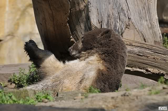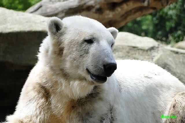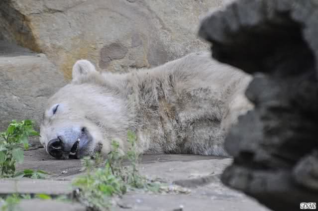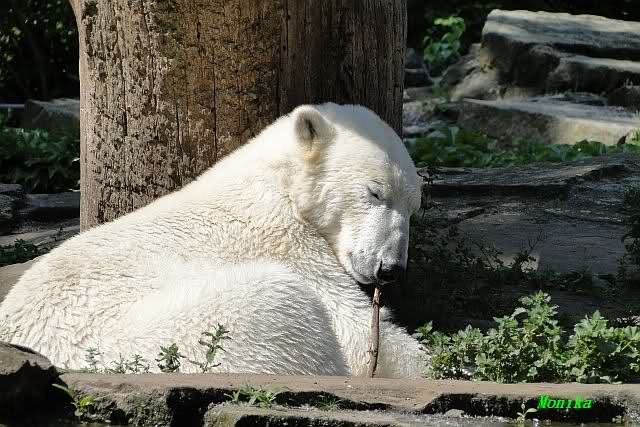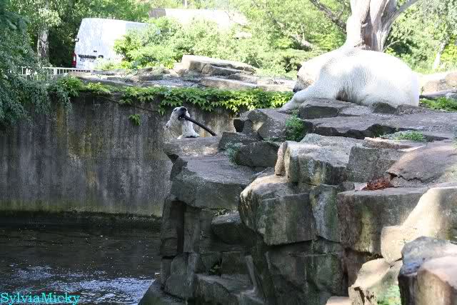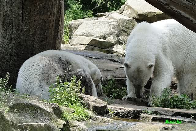 Wir kamen heute nach unendlichen Staus um 09.50 im Zoo an. Viele der Anwesenden fingen an zu lachen und sagten, dass Knut und Gianna um 09.45 aufgehört hatten im Wasser zu toben. Knut lag nun in seiner Kuhle und schlief. Er hob kurz den Kopf und der war schon schwarz! Gianna lief auf der Anlage umher.