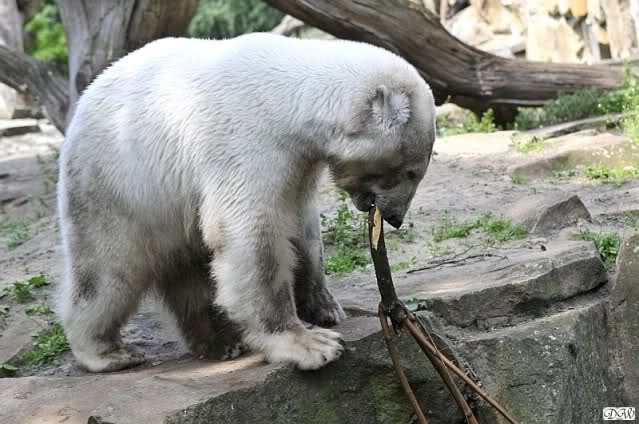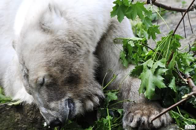 Herr Henkel kam und brachte Zweige für die Braunbären und auch für Knut und Gianna. Nachdem Knut von Herrn Henkel gerufen wurde, stand er kurz auf um zu sehen, was es Neues gab. Gianna kam angerannt und machte die tollsten Verrenkungen um an die Zweige zu kommen. In ihrer Ahnentafel ist garantiert eine Schneeziege zu finden. Knut dachte sich wohl, Gianna solle sich doch verausgaben, er schlief lieber weiter. Erst später hatte er sehr viel Spaß mit dem Grün.