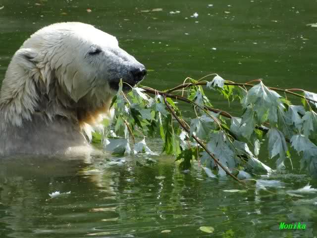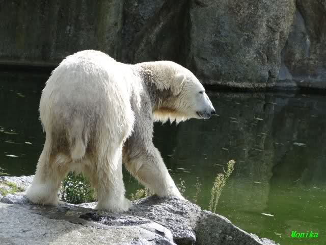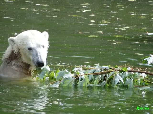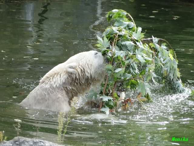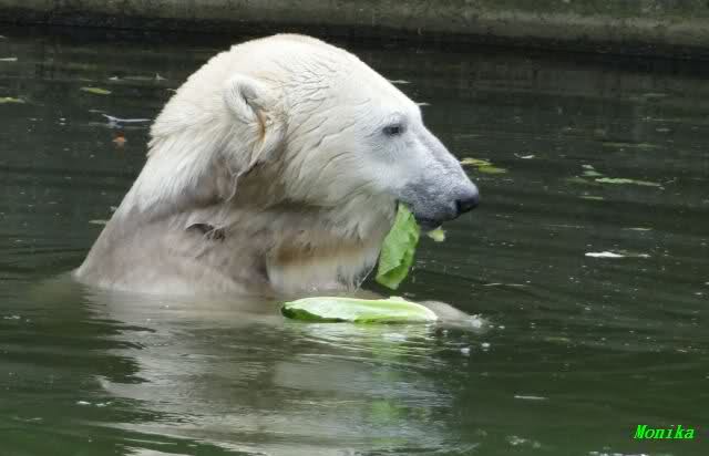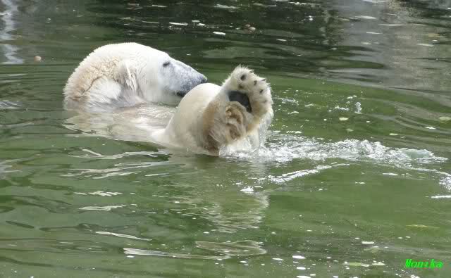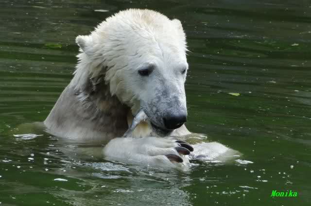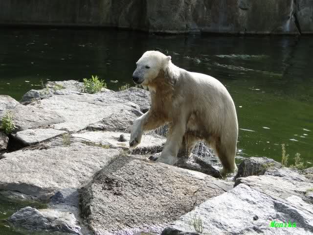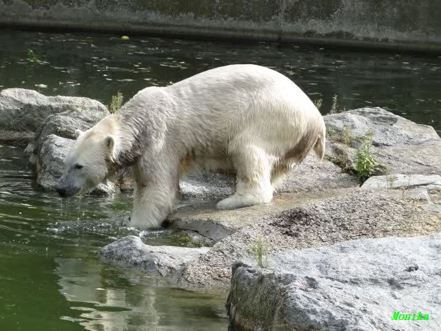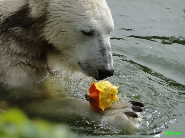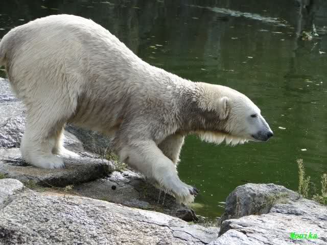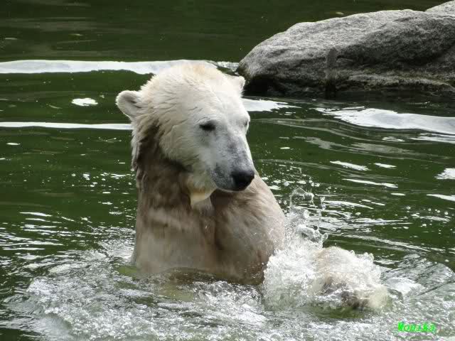 Vielen Dank an Monika für die Fotos von Knut und dass Ihr Euch in Berlin so rührend um den Eisbären kümmert. Als der Pfleger damals von heute auf morgen starb, war das für Knut sicherlich eine Traumatisierung. Er lief im Gehege auf und ab und hielt ständig Ausschau nach dem Pfleger. Eine Eisbärenmutter hatte er ebenfalls nicht. Dem Junge fehlt bestimmt eine ordentliche Portion Substanz. In der Arktis wäre er lebensunfähig. Mit Gianna wurde der fehlende Körperkontakt, den er als Eisbärenbaby nicht bekam, etwas ausgeglichen. Dann ging Gianna von heute auf morgen. Ich höre zwar desöfteren, dass ihm Gianna nicht fehlt und dass er den Verlust gut wegsteckte. Bin mir da aber aufgrund der Vergangenheitserlebnisse nicht so sicher. Ich beobachte, dass Raubtiere hochempfindsam sind. Beim Tiger beobachte ich, dass sie genau merken, wenn ein provokativer Mensch vor ihnen steht. Die Ausstrahlung, die Schwingung, das kommt rüber. Es wurde beobachtet, dass Pferde beim Schlachttransport Tränen hatten. Käme Knut in einen anderen Zoo, hätte er sicherlich dieses Angstzittern auch. Hoffentlich klappt das dort in den nächsten Wochen. Ein bisschen Vertrauen ins Leben und in die Pfleger habe ich schon, obwohl ich Nationalparks vorziehe. Ich bin zwar nur ein Laie, mache jedoch so meine Beobachtungen mit Tieren. Es wird bestimmt gut gehen, das hoffe ich.