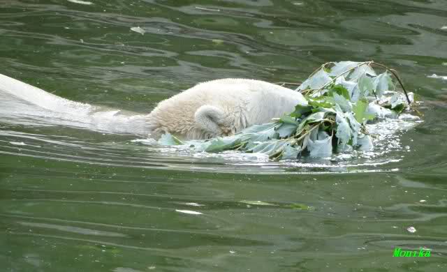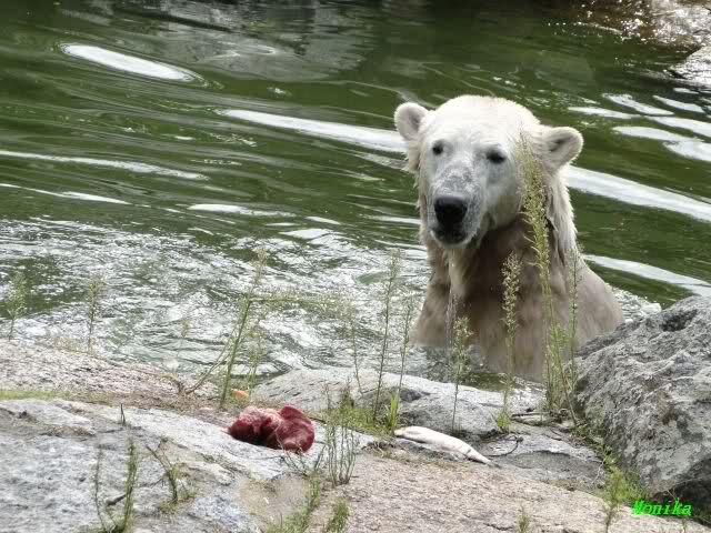 The events of the morning have already been described in full detail. At about 13.30 h, Knut went slowly –as if he was walking on ice – towards the water and drank quite a lot. Shortly thereafter, he went into the water and started to swim around in the entire pool, sniffing at Lars’ former isle and Tosca’s one. He also came to the glass shield for a short while. Although the keepers first worried about the fact that so far he did not eat, they were nicely surprised to find him already in the water. And so, the grapes wee the first that came flying. Knut was a bit helpless and did not know quite exactly where to eat them. Well, obviously, he is no longer having a kitchen table and so, he was eating them in the water. Then fishes, meat and the other stuff followed their way in the water and a lot of food was thrown on Lars’ isle. Nevertheless, Knut could not or dare not enter the isle and he was sitting beside it and tried to fish the food, maybe hoping that the food would come swimming. But alas, it did not help. Again and again, he tried to climb the isle and fished for the leftovers (and there a still some on it). After lunch, Knuti continued his swimming. And then Mrs. Weckert arrived with two big twigs and throw them into the water. First, Knuti looked at them, but shortly thereafter started to play (just as he was used to do before). We were all so relieved. Shortly thereafter, things changed a little. Knuti was on Tosca’s isle and trembled over his entire body. An this took quite a while. When he then finally found the courage to jump into the water, everything went better again. He played a little with the twigs and continued his swimming. It goes without saying that I would have wished to stay longer, but after 7.50 hours my feet started to protest.