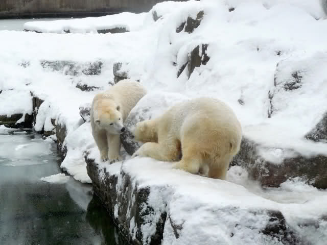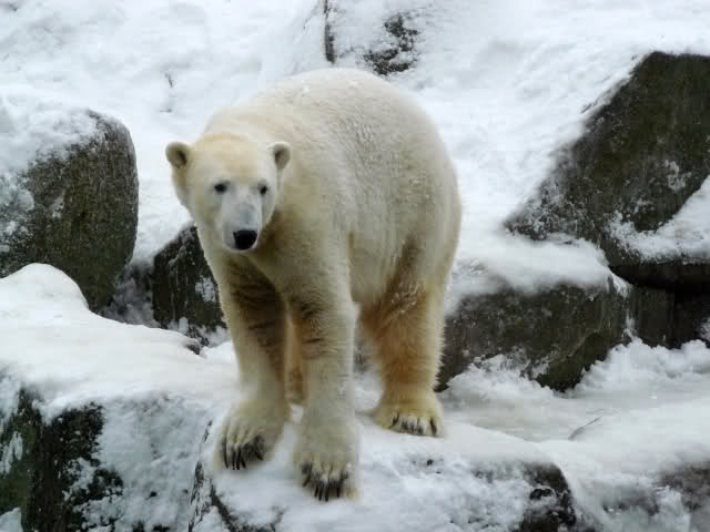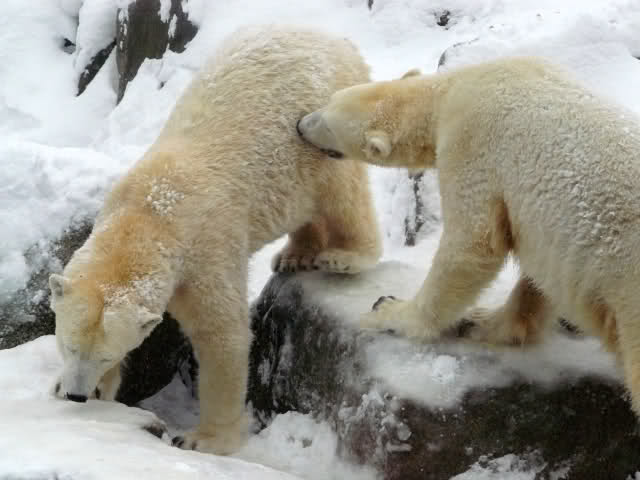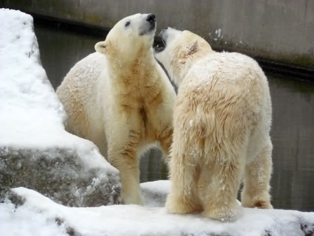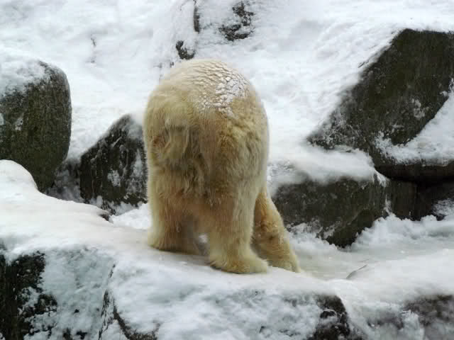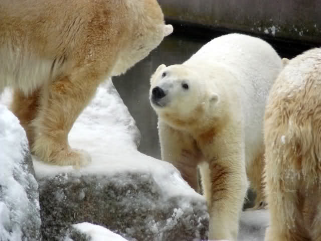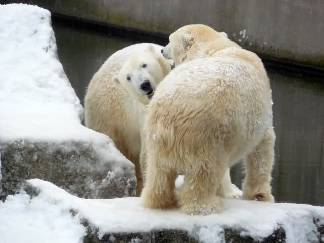 Was nun? Knut guckte enttäuscht den jungen Männern nach und warf mir einen Blick zu, den ich nicht aushielt. Ich gab auf und ging ins Affenhaus, um mich aufzuwärmen und mit meinen ungeeigneten Armen zu hadern. Als ich wiederkam, sah ich schon an der Menschenmenge, dass sich was getan haben musste. Tosca unternahm einen Spaziergang zu Knuts Eck, gefolgt von Nancy, die sich über die glatten Steine hievte. In freundlicher Absicht! Die Begegnung verlief aufs Erfreulichste, was Ihr den Bildern entnehmen könnt. Als Kati auftauchte, lief Knut in die rechte Ecke, verfolgt von den Damen, die ihren Spielgefährten nicht so rasch entkommen lassen wollten. Bei Kati fauchte er, aber ansonsten schien Knut nicht unerfreut zu sein über den Besuch der gewichtigen Damen. So richtig schön wurde es aber, als er schließlich während der beginnenden Dämmerung der alleinige Herr des Territoriums war. Er bearbeitete den Tannenbaum, bis der keinen Widerstand mehr leistete, nicht ohne sich zu vergewissern, dass Kati, Nancy und Toska in sicherer Obhut waren. So verlebten wir doch noch einen schönen Nachmittag in und vor Knuts Gehege.