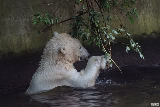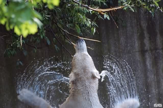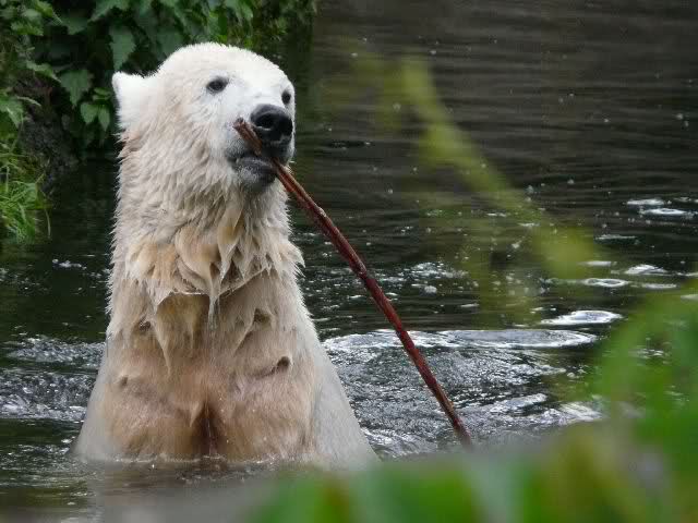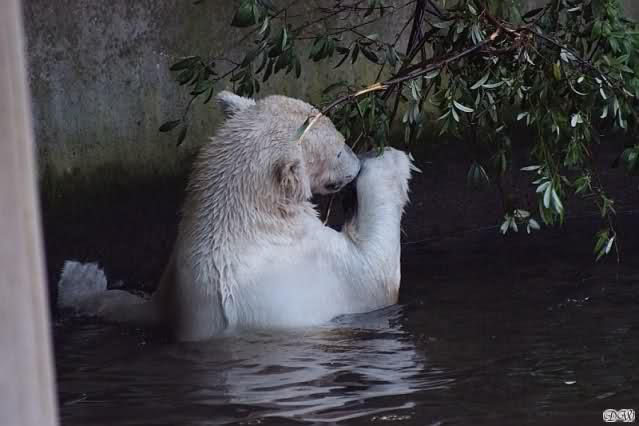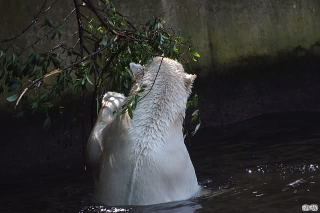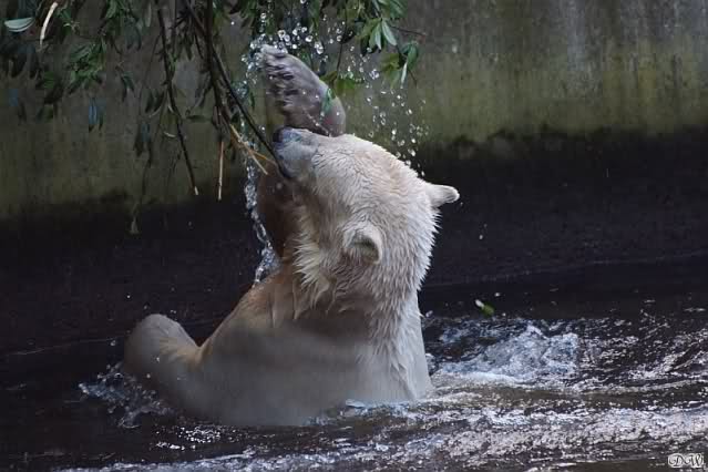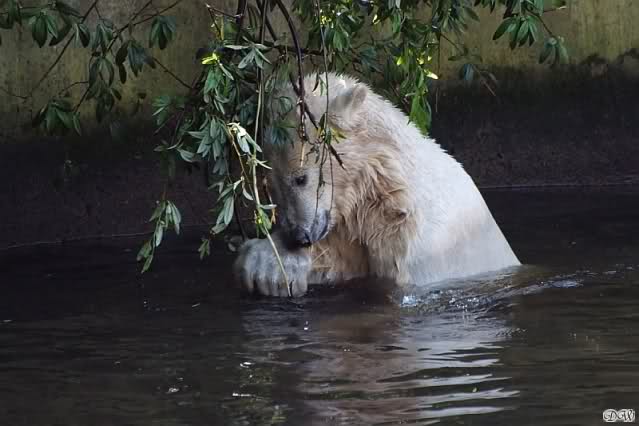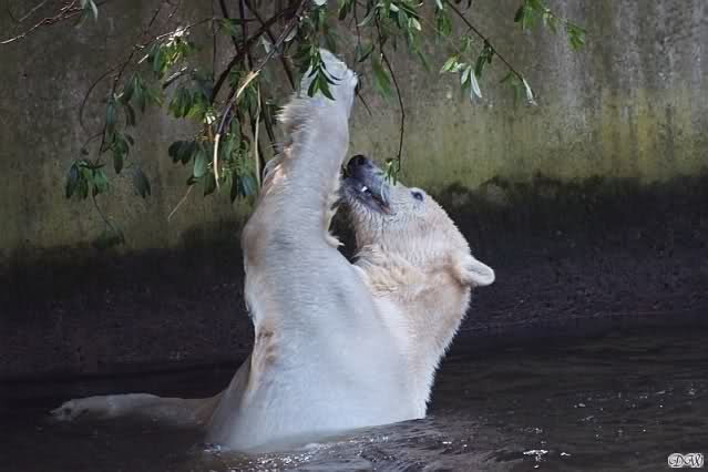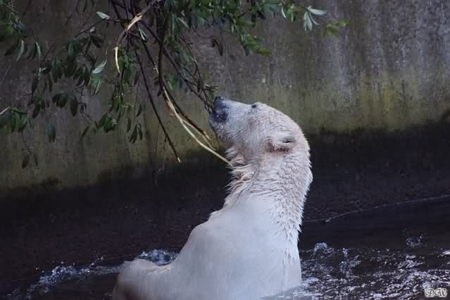 Der Baum hat es Knut nun schon seit Tagen angetan. Immer wieder springt er hoch und sieht einen Ast zu sich herunter. Die Blätter zieht er ab, aber auch kleinere Äste hat er sich schon abgebrochen. Lange dauert es nicht mehr und er wird den Ast vollkommen im Wasser haben. Zwischenzeitlich spielt er mit den Nackthuhn, mit Bällen, den Pflanzkugeln, nur um immer wieder nach hinten zu schwimmen und hochzuspringen um den Ast ins Wasser zu bekommen. Mal sehen, wie lange es noch dauert bis er ihn vollkommen im Wasser hat.