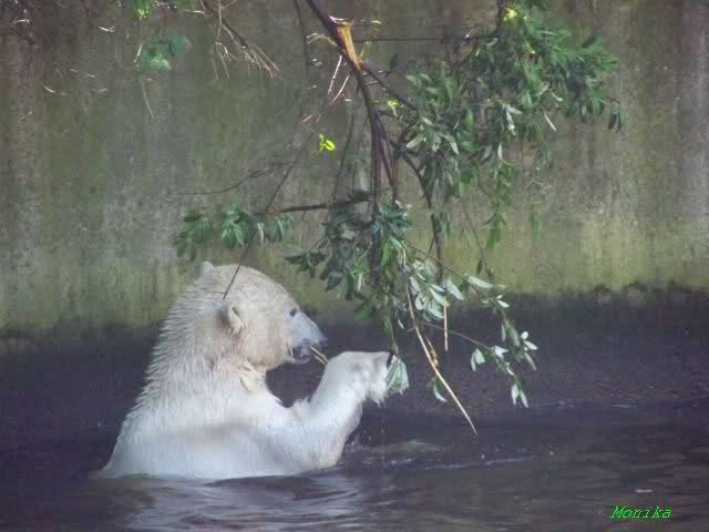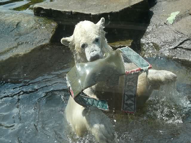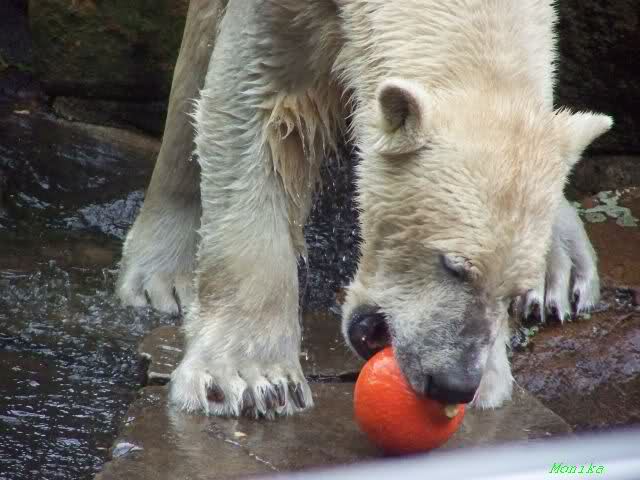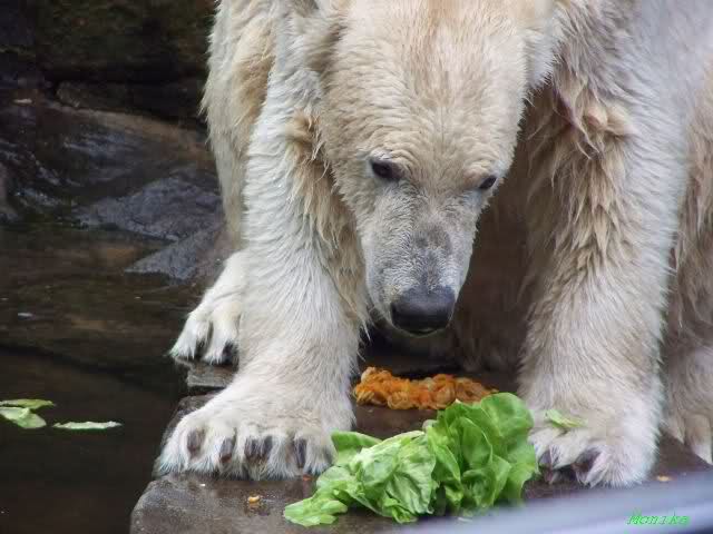 Als ich heute in den Zoo ging tobte Knut fröhlich im Wasser mit allem was er fand. Er bekam heute reichlich zu essen. Bananen, Apfel, Birne, Weintrauben, Brot, Fisch, Fleisch, Rüben, eine frische Lachsforelle und einen Ochsenschwanz. Gefüttert wurde er von Herrn Röbke.