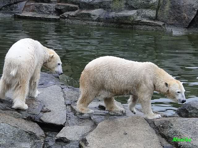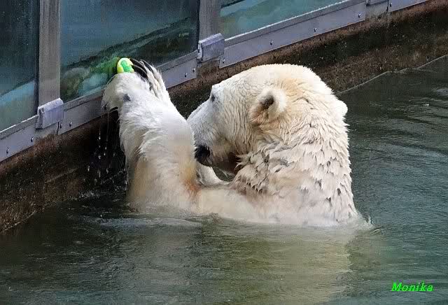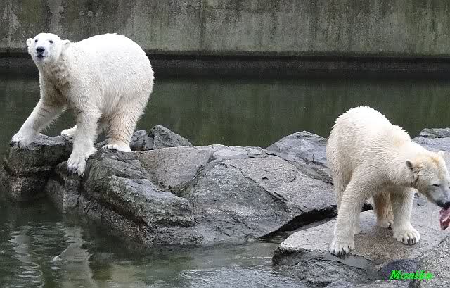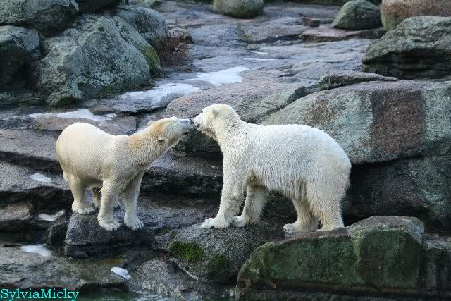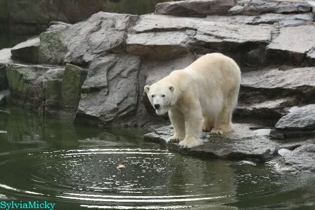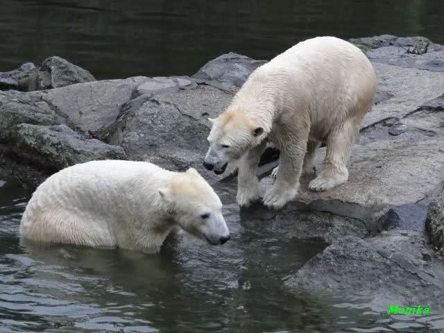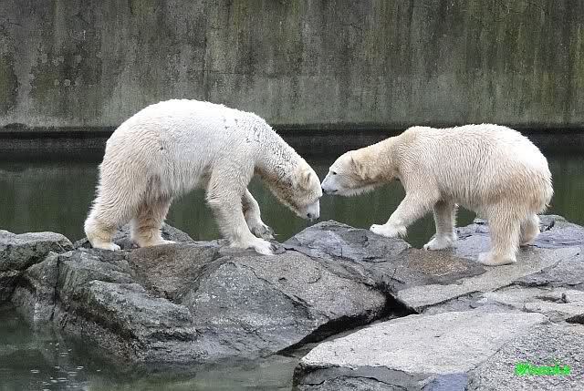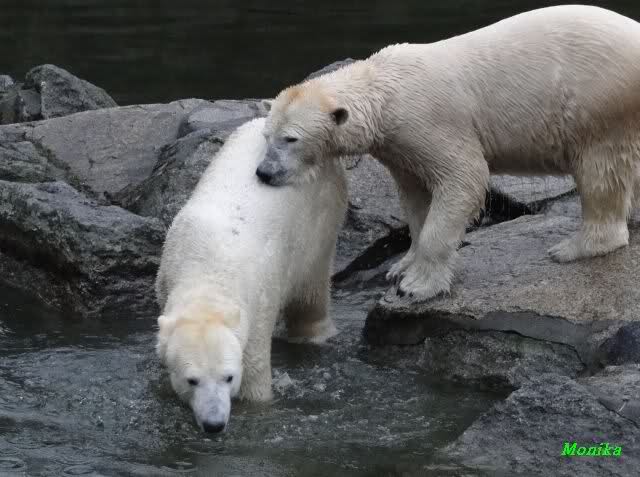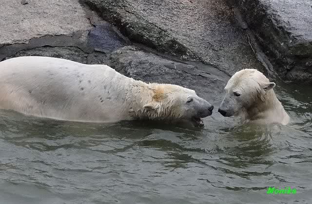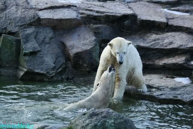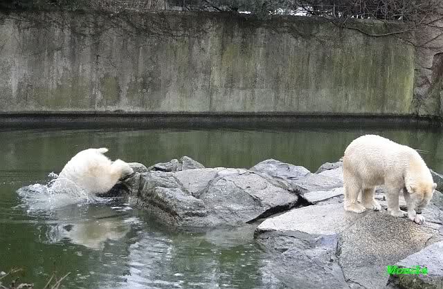 Früh spielten Knut und Tosca im Wasser. Als ich kam, war Tosca im Wasser und Knut stand vor ihr auf der Anlage. Sie schmusten miteinander. Tosca kam dann raus und Knut legte sich vorne auf die Anlage! Tosca lief hinter ihm immer hin und her. Er blieb aber liegen. Zur Fütterung war er auf der rechten Seite, ging aber auf das Plateau und ließ sich dort füttern! Wieder ein Schritt für ihn.