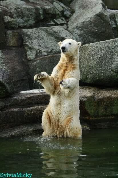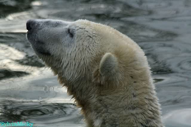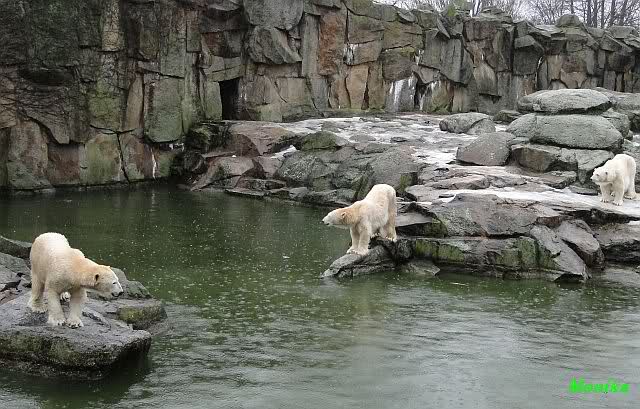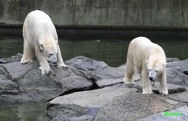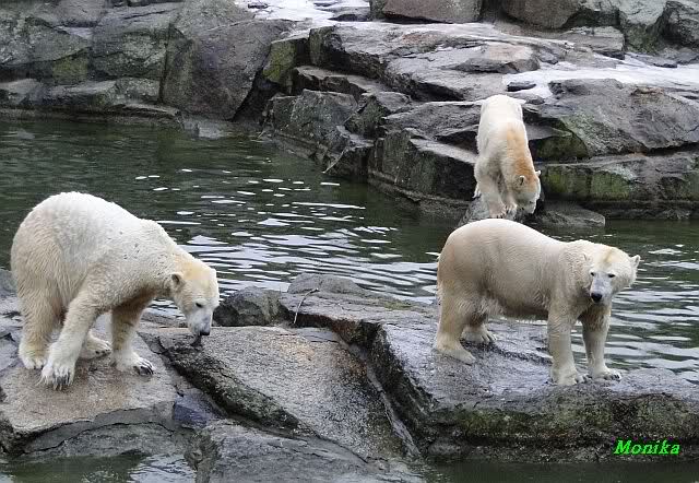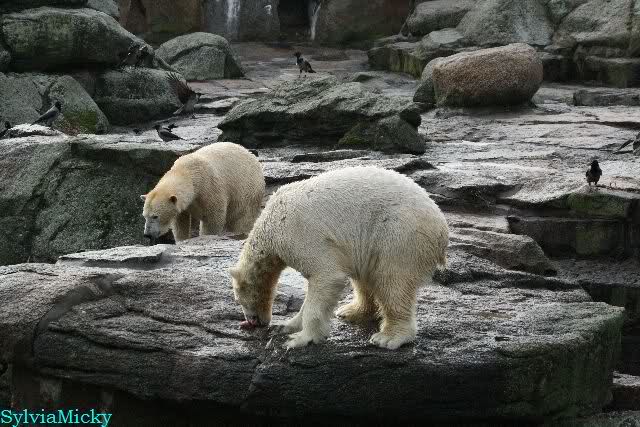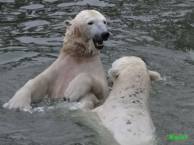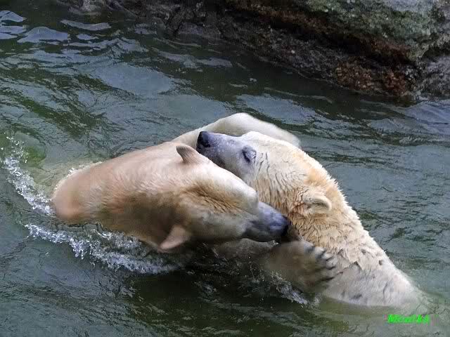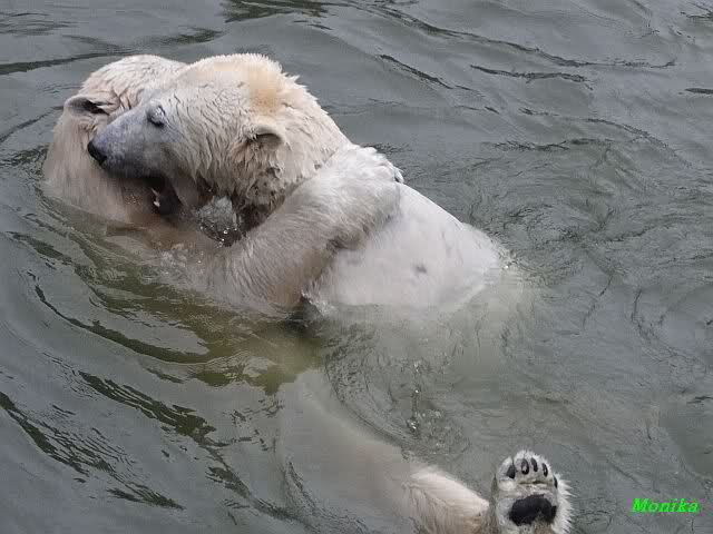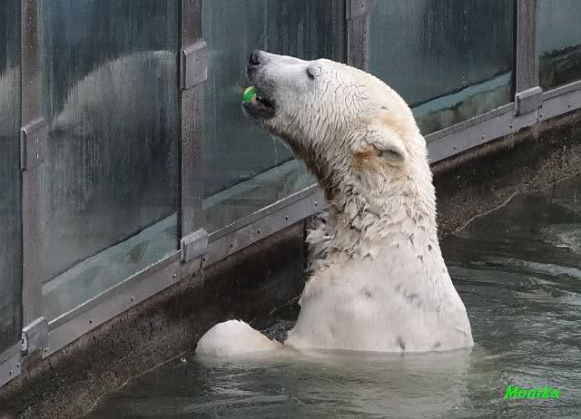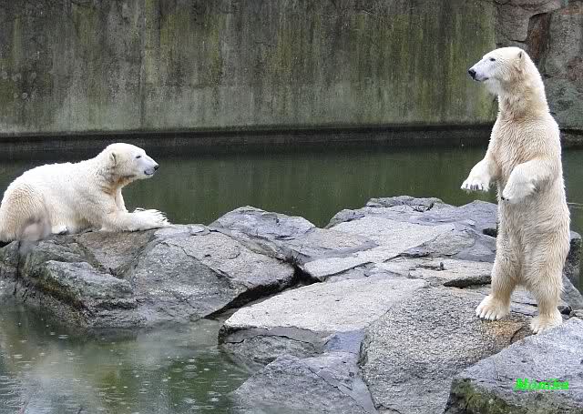 Früh spielten Knut und Tosca im Wasser. Als ich kam, war Tosca im Wasser und Knut stand vor ihr auf der Anlage. Sie schmusten miteinander. Tosca kam dann raus und Knut legte sich vorne auf die Anlage! Tosca lief hinter ihm immer hin und her. Er blieb aber liegen. Zur Fütterung war er auf der rechten Seite, ging aber auf das Plateau und ließ sich dort füttern! Wieder ein Schritt für ihn.