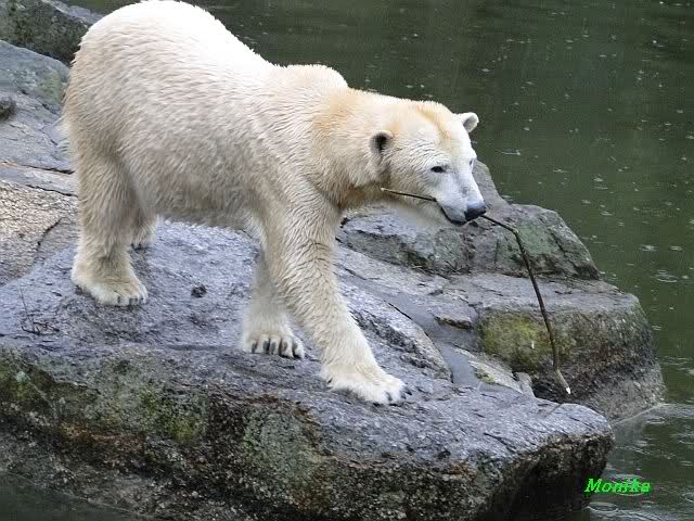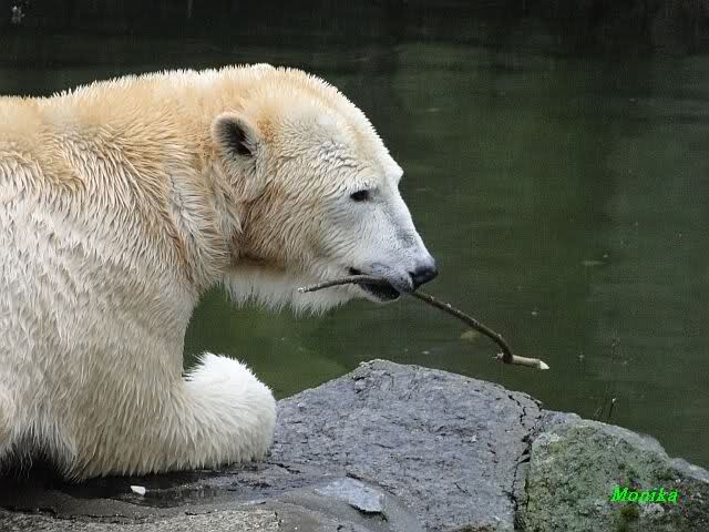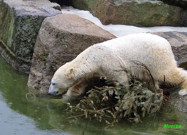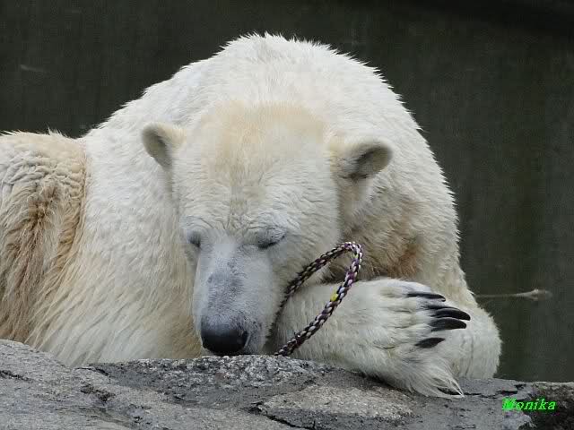 Nach der Fütterung schwamm er im Wasser und fand noch mehrere Stücke Fleisch. Tosca nahm sich den ollen Baum und ging mit dem Baum auf den Felsen zu Nancy. Kati lag am unteren Ende des Felsens.