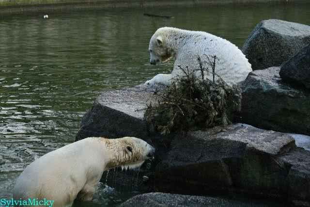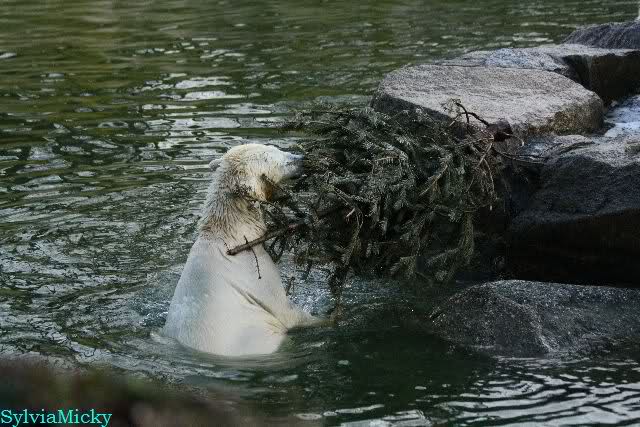 Knut spielte mit dem Weihnachtsbaum, verschiedenen Tüchern mit Restbällen und dem kleinen grünen Ball. Aber er schaute immer wieder zu Tosca. Als sie nicht spielen wollte, schwamm er zur Scheibe und zeigte den Rest vom Lederball. Es waren heute, auf Grund des sonnigen Wetters, viele Besucher im Zoo.