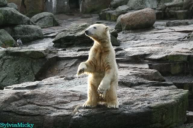 Aber irgendetwas weckte sie und sie bewegte sich. Knut ging dann doch lieber übers Plateau in seine Ecke. Er lief nochmals zum Plateau, sah aber Kati, die inzwischen wach war und beschloß wieder in seine Ecke zu gehen. Er stellte sich dann an den Felsen hoch, sah aber die Bärinnen und legte sich dann auf seine Ecke und döste.