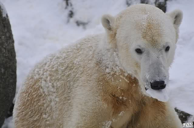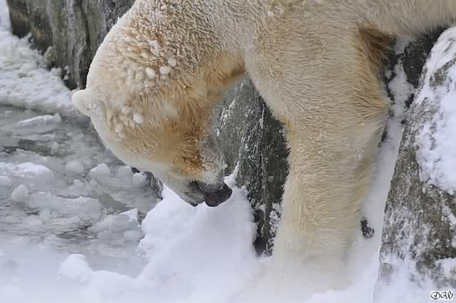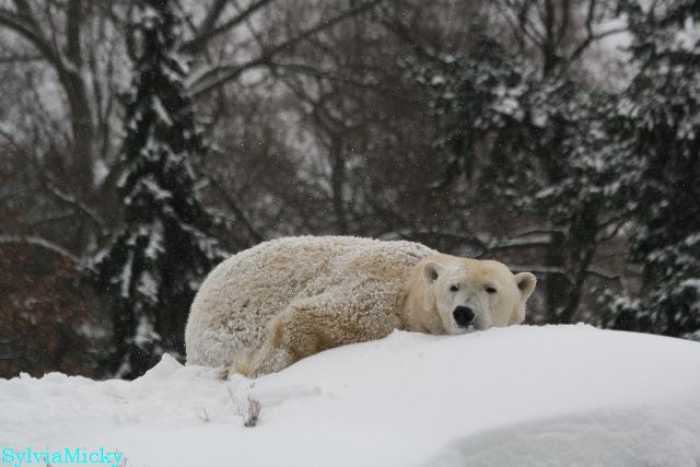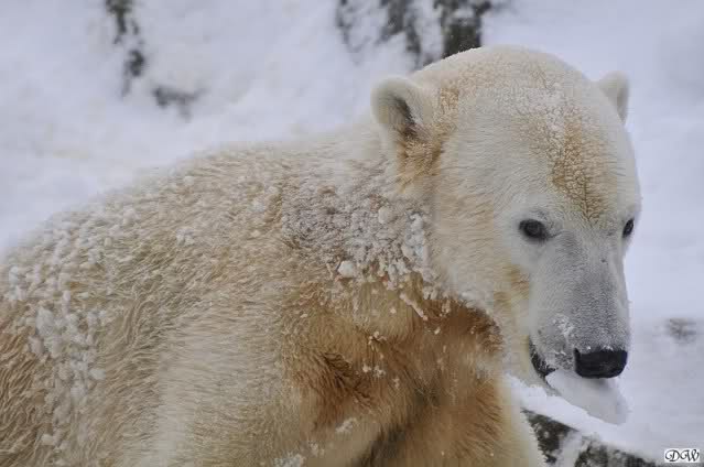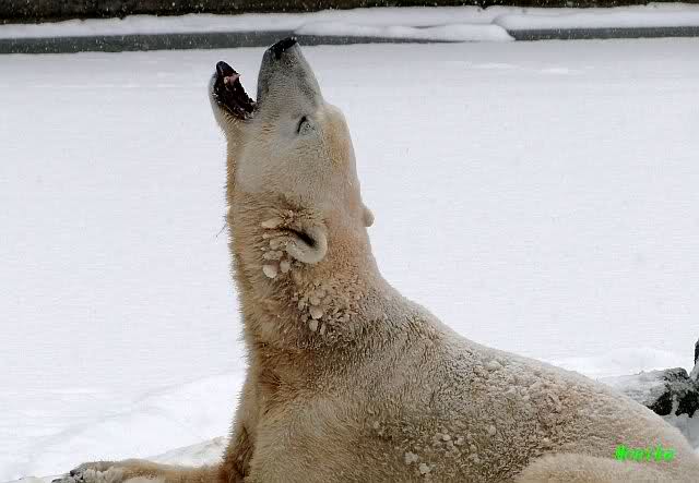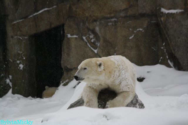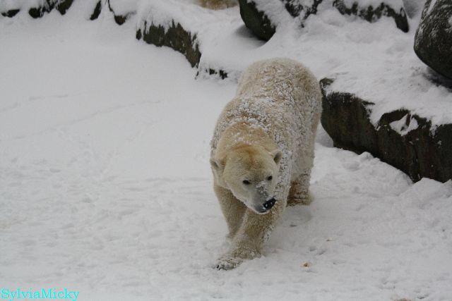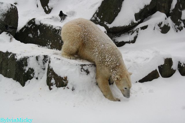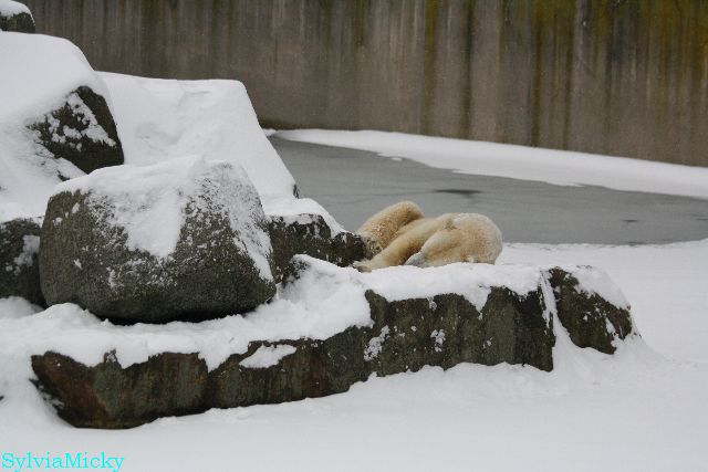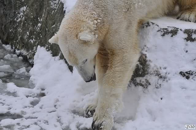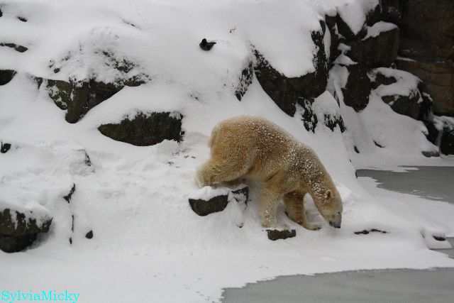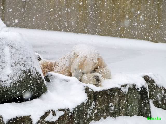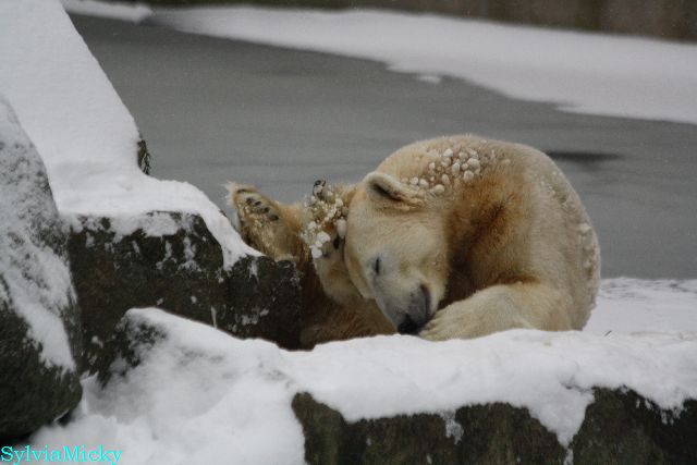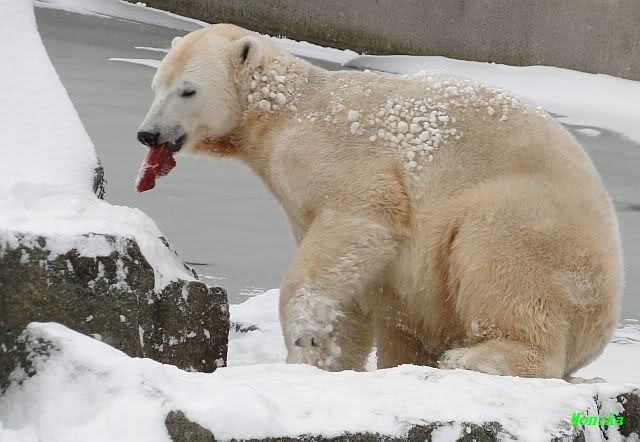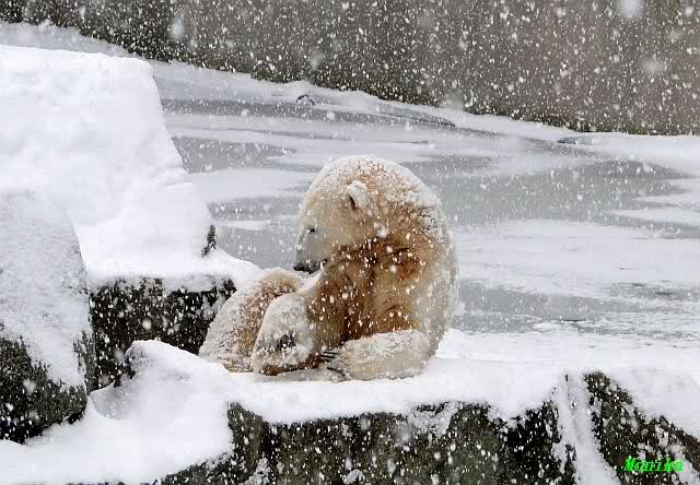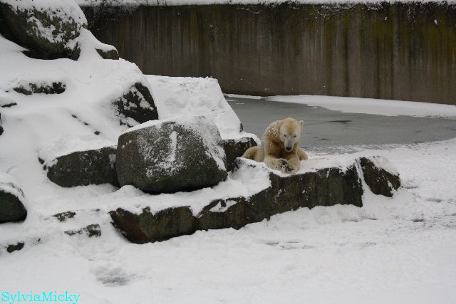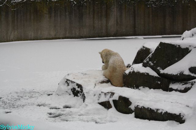 Bei diesem Wetter die Eisbären zu sehen, das sollte man nicht versäumen. Also ging ich am späteren Nachmittag in den fast menschenleeren Zoo. Ein wenig hatte ich die Hoffnung, Knut würde durch sein "Lieblingselement", den Schnee, seine Befangenheit ablegen und sich lustvoll wälzen wie im letzten Winter...