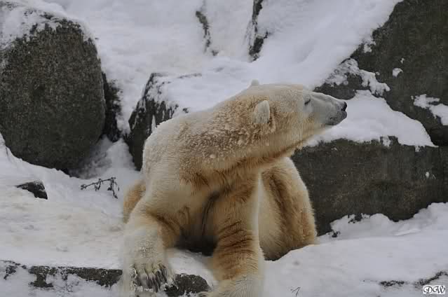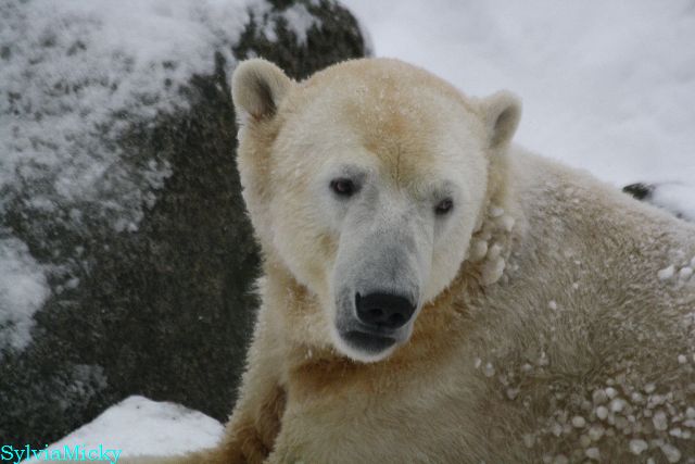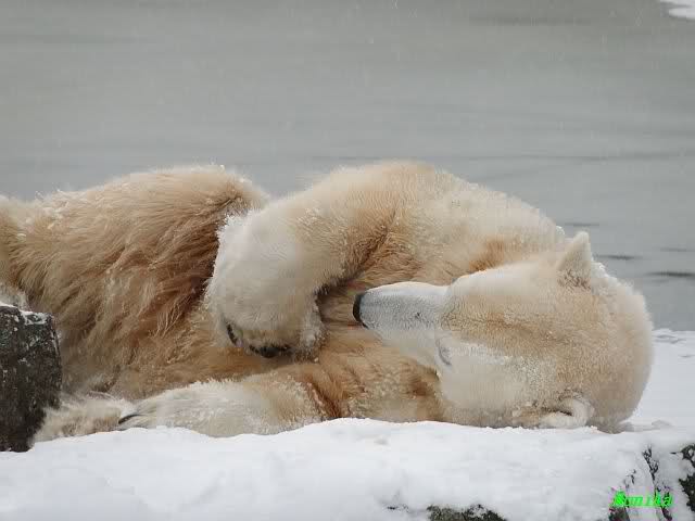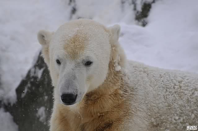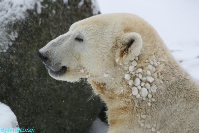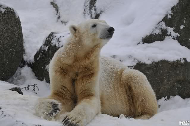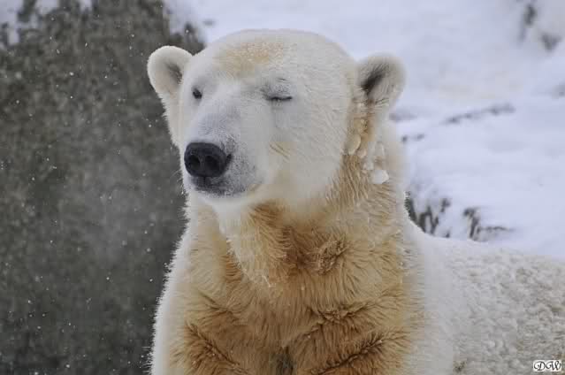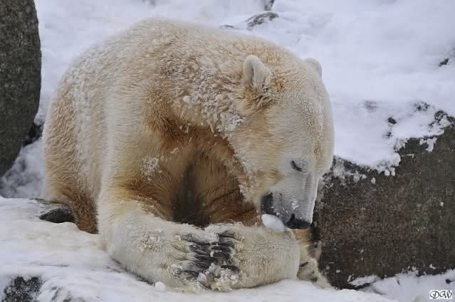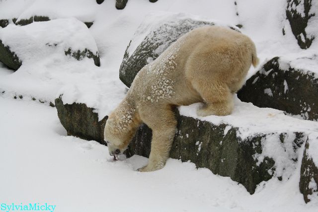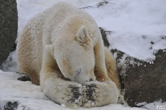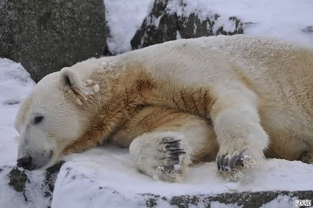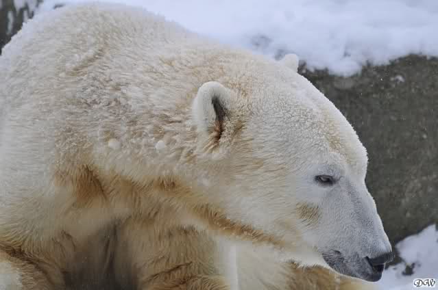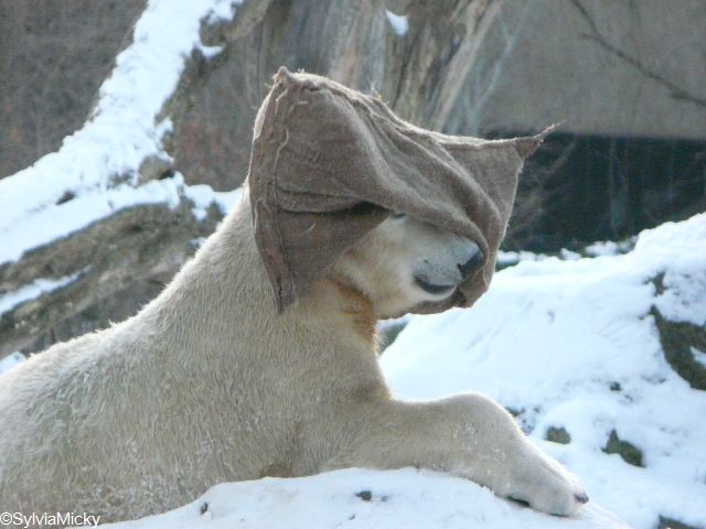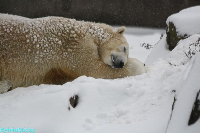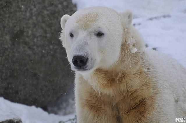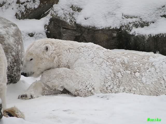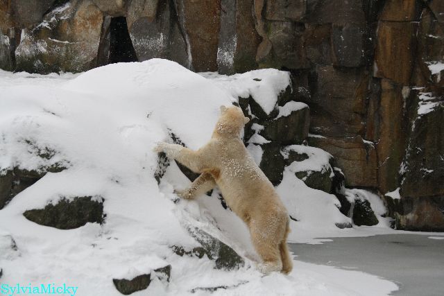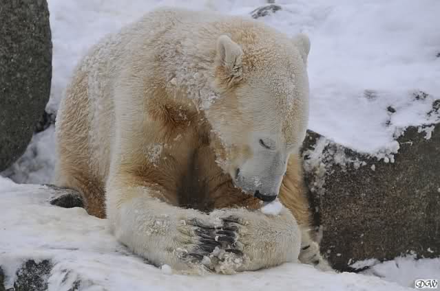 Bei diesem Wetter die Eisbären zu sehen, das sollte man nicht versäumen. Also ging ich am späteren Nachmittag in den fast menschenleeren Zoo. Ein wenig hatte ich die Hoffnung, Knut würde durch sein "Lieblingselement", den Schnee, seine Befangenheit ablegen und sich lustvoll wälzen wie im letzten Winter...