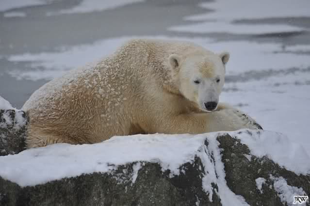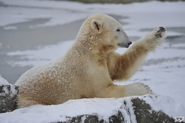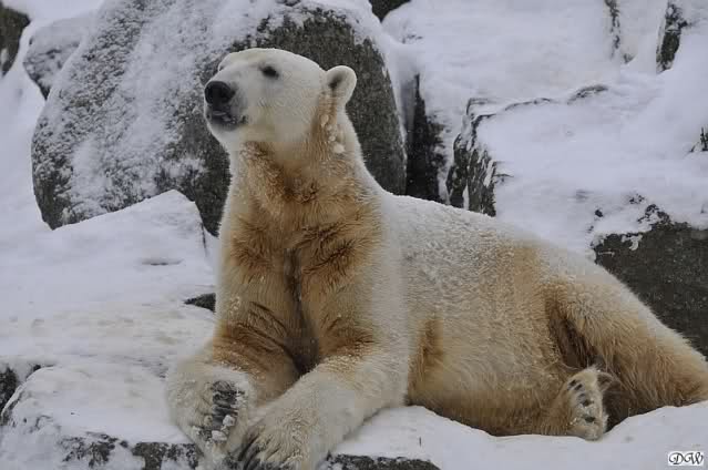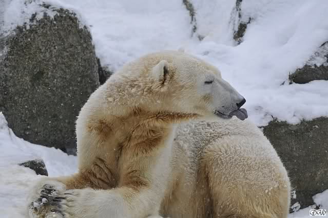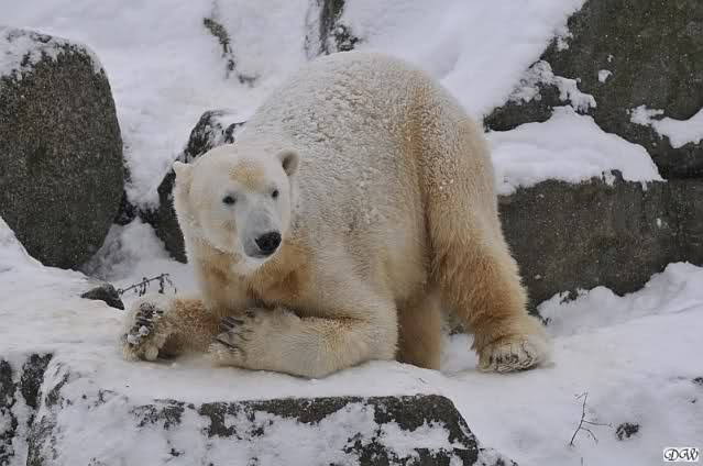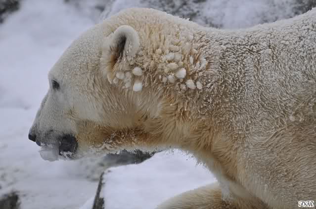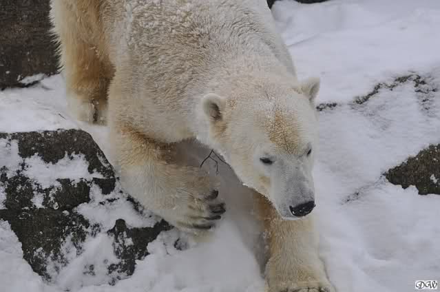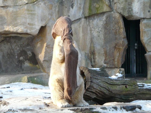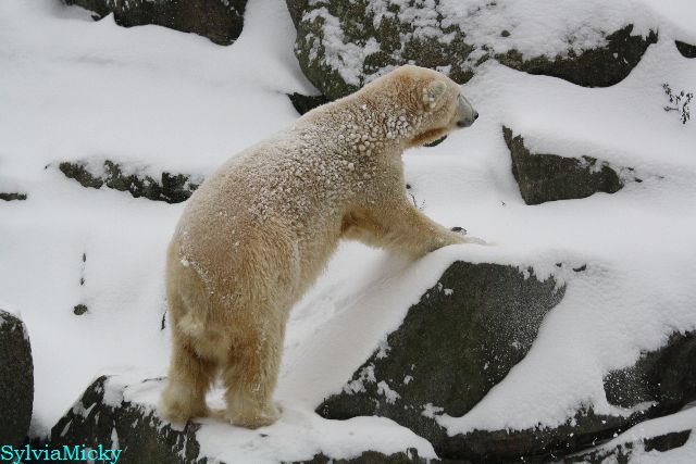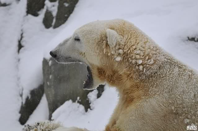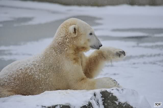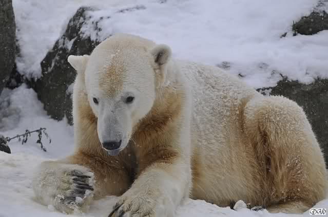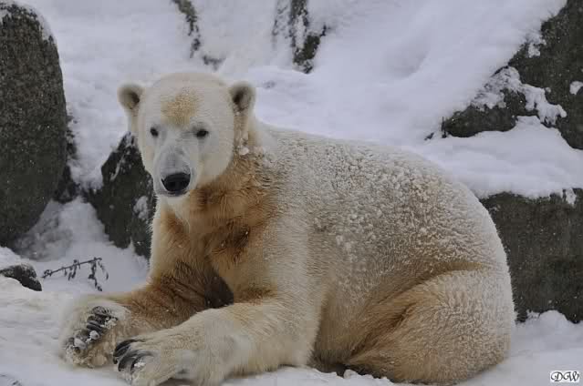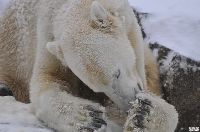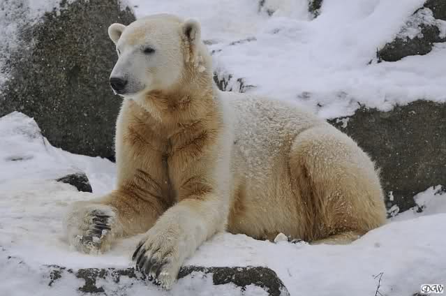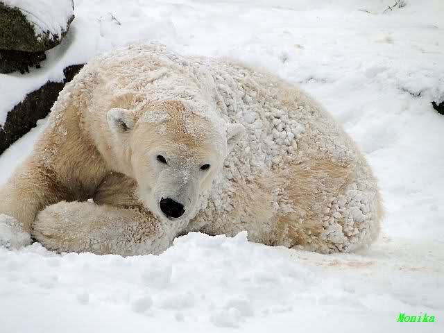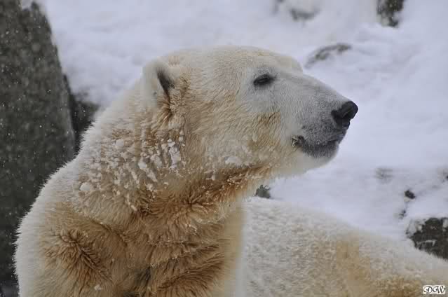 Bei diesem Wetter die Eisbären zu sehen, das sollte man nicht versäumen. Also ging ich am späteren Nachmittag in den fast menschenleeren Zoo. Ein wenig hatte ich die Hoffnung, Knut würde durch sein "Lieblingselement", den Schnee, seine Befangenheit ablegen und sich lustvoll wälzen wie im letzten Winter...
