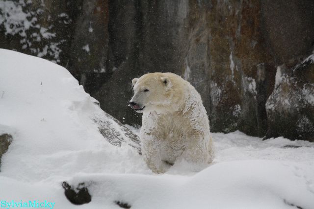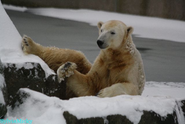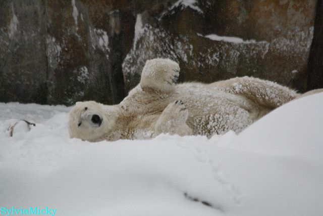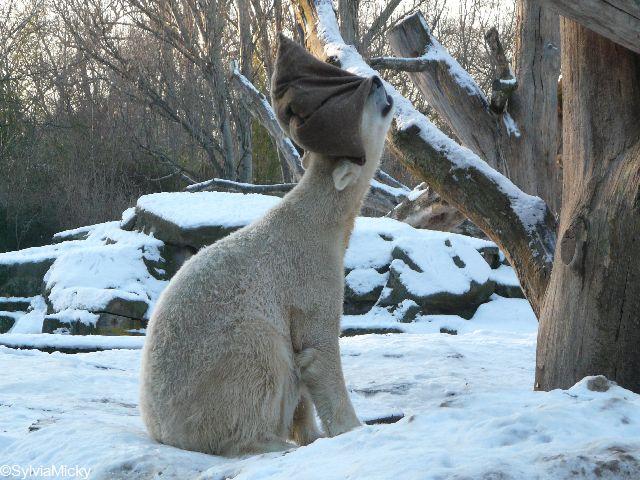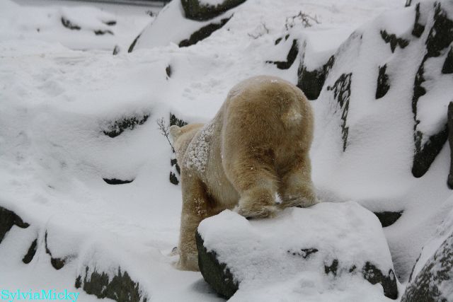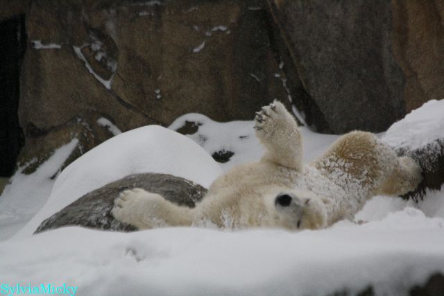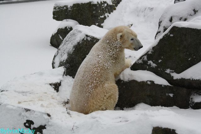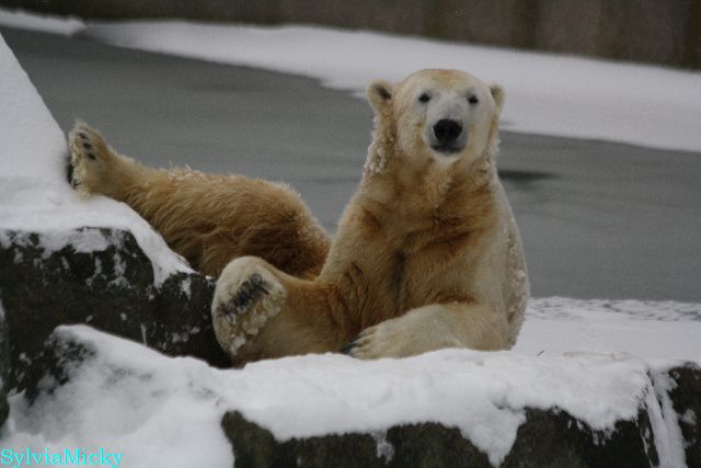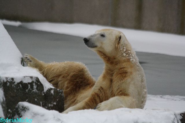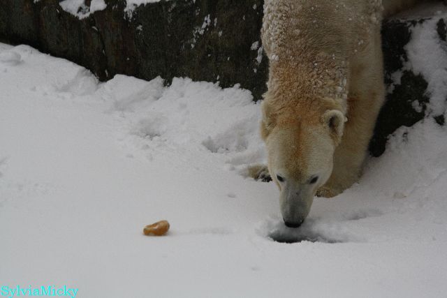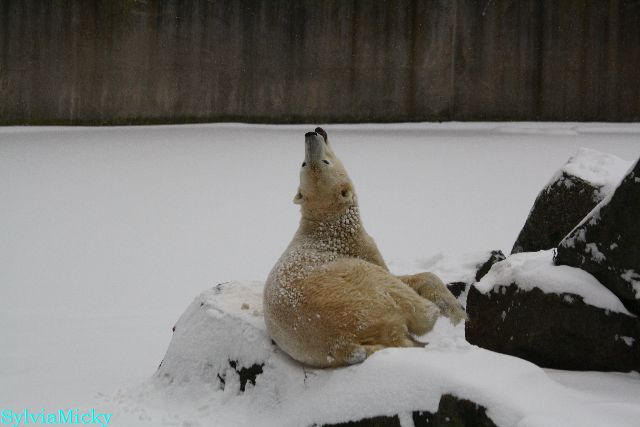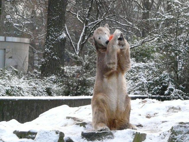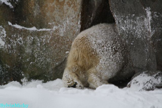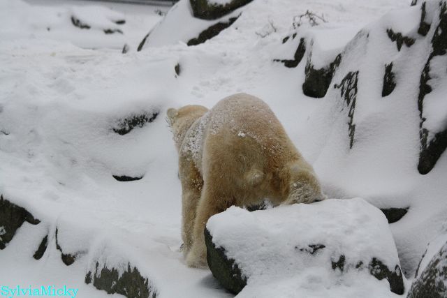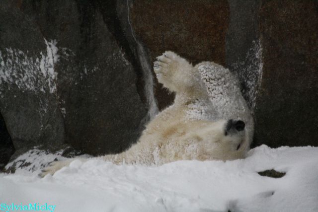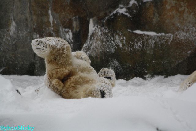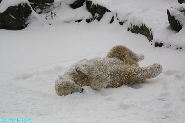 Katharina, da haben Sie aber etwas verpasst. Nachdem die Bärinnen drinnen waren, wälzte sich Knut sehr lange Zeit im Schnee und genoss es ganz offensichtlich. Es waren einige Fotografen da, darunter auch Birgit Born.