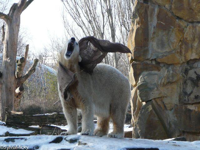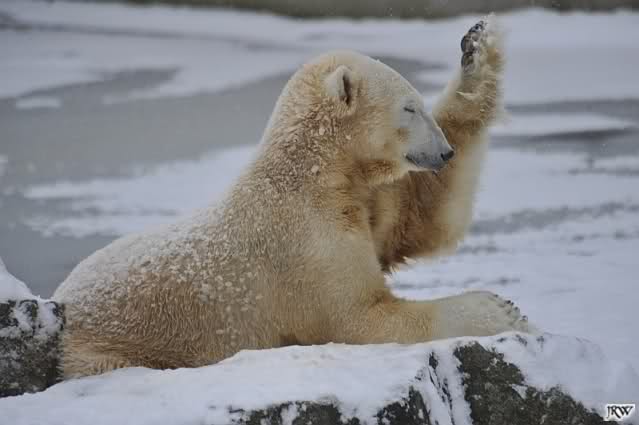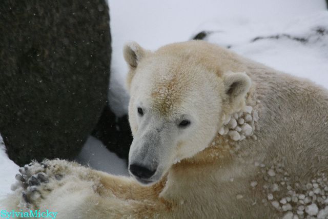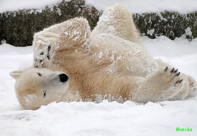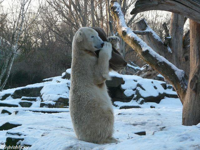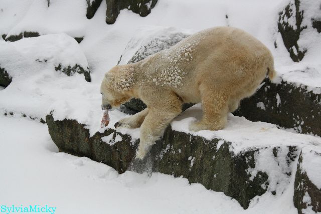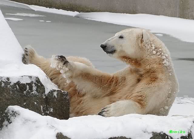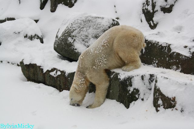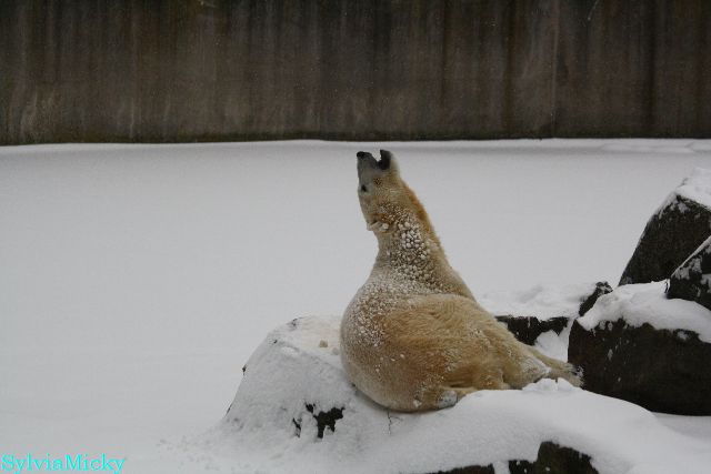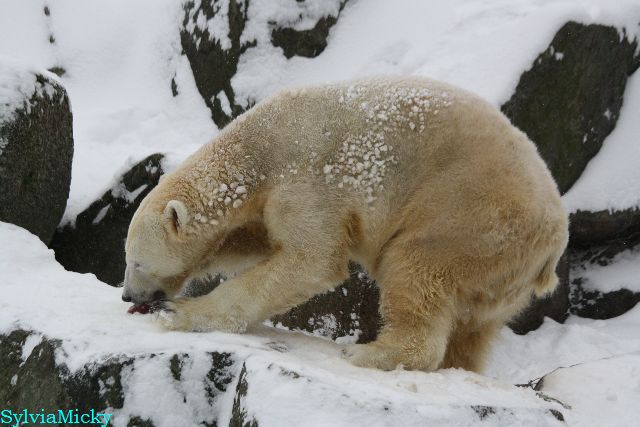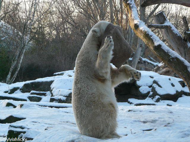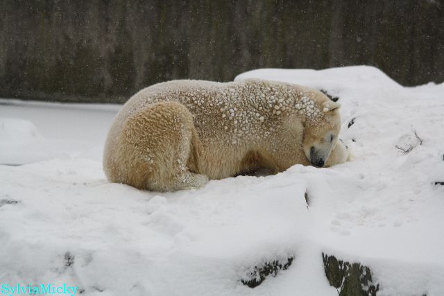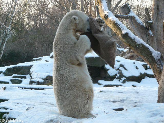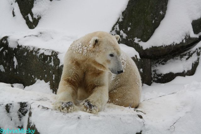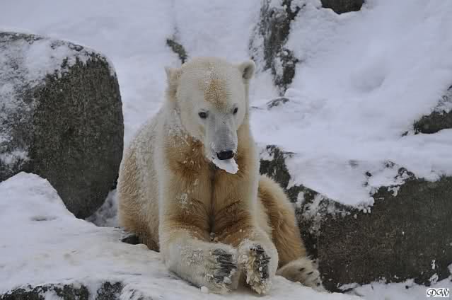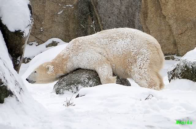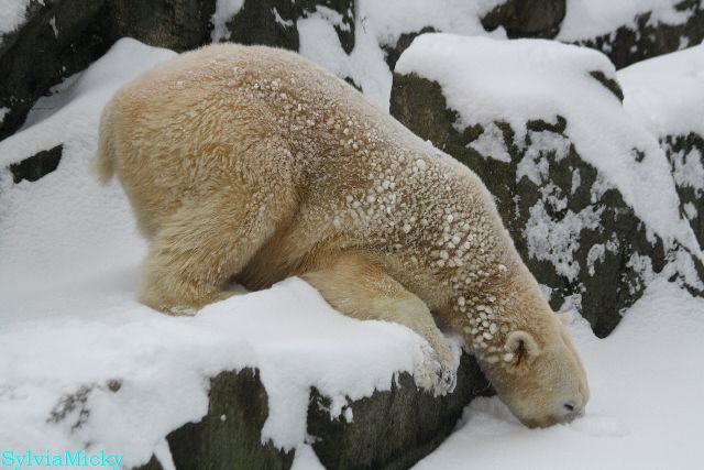 Katharina, da haben Sie aber etwas verpasst. Nachdem die Bärinnen drinnen waren, wälzte sich Knut sehr lange Zeit im Schnee und genoss es ganz offensichtlich. Es waren einige Fotografen da, darunter auch Birgit Born.