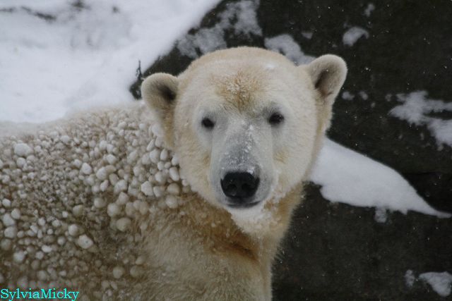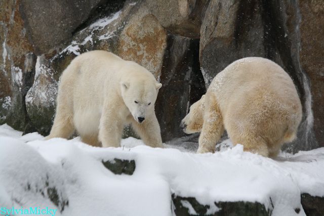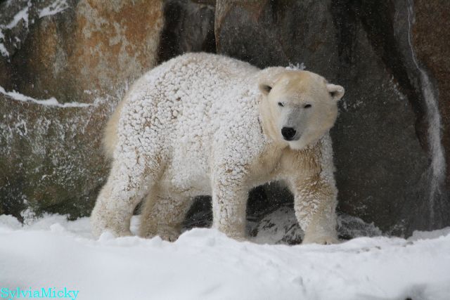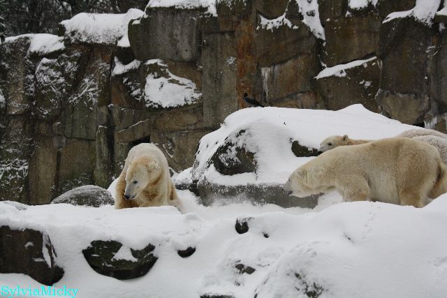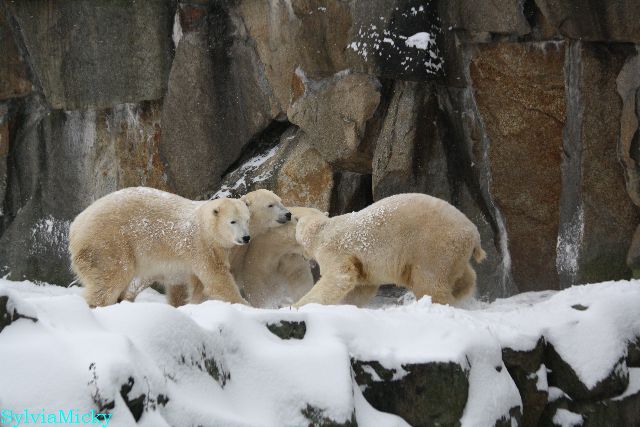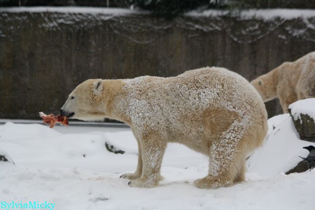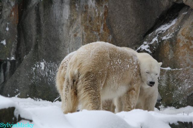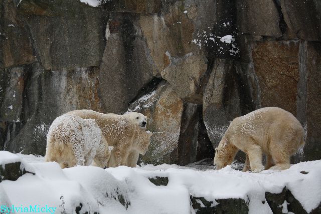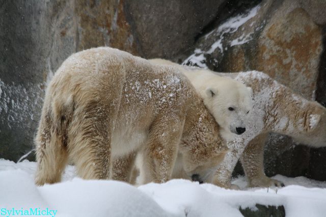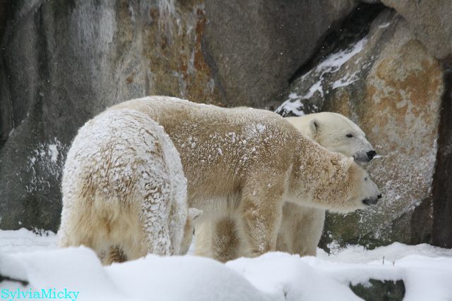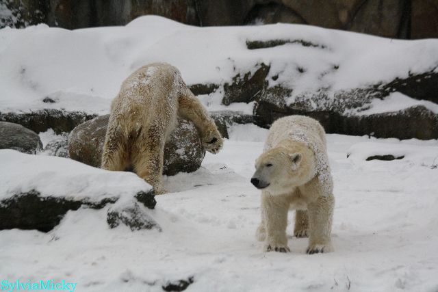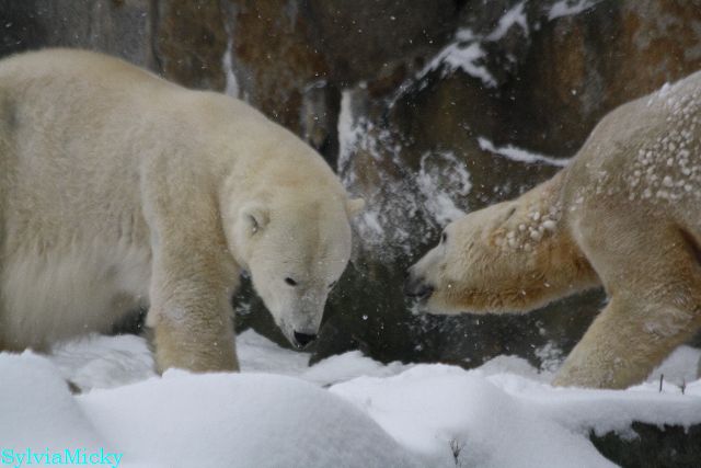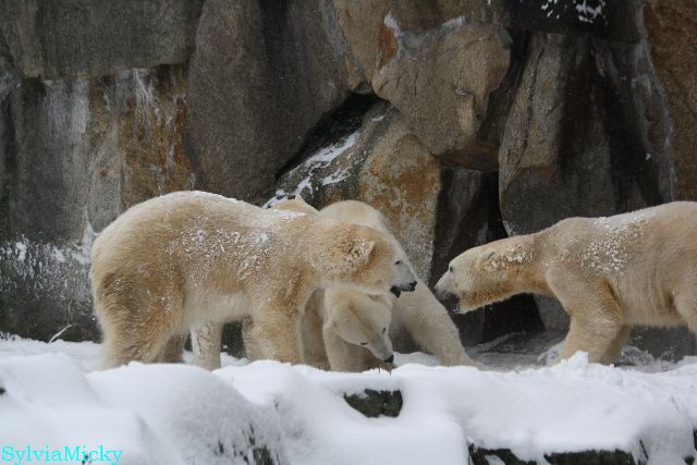 Richtiges Eisbärenwetter. Am meisten hat Tosca den Schnee genossen. Sie war für mich heute die Schneekönigin. Knut war doch etwas verhalten, allerdings gab es auch wieder eine Auseinandersetzung mit Kati. Das mußte er erst einmal verdauen.