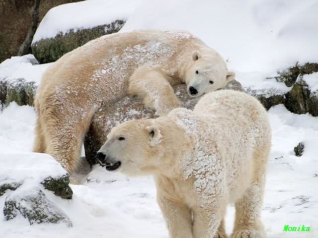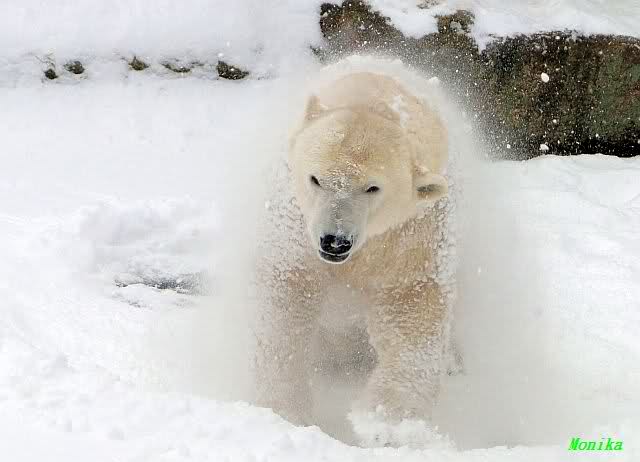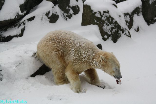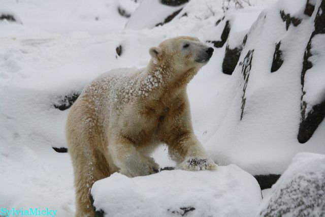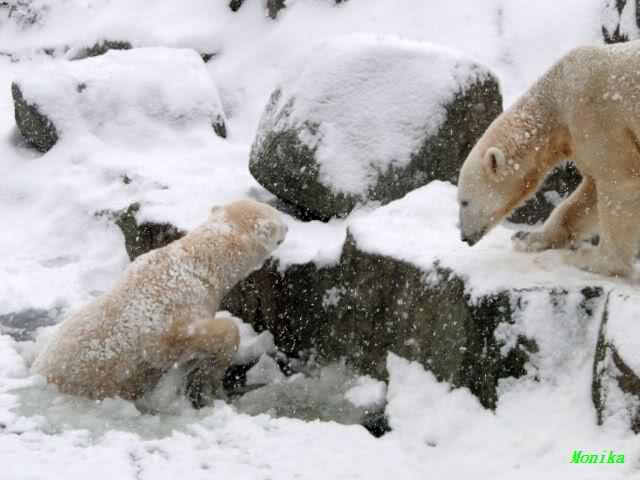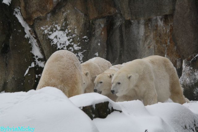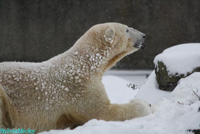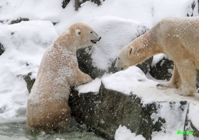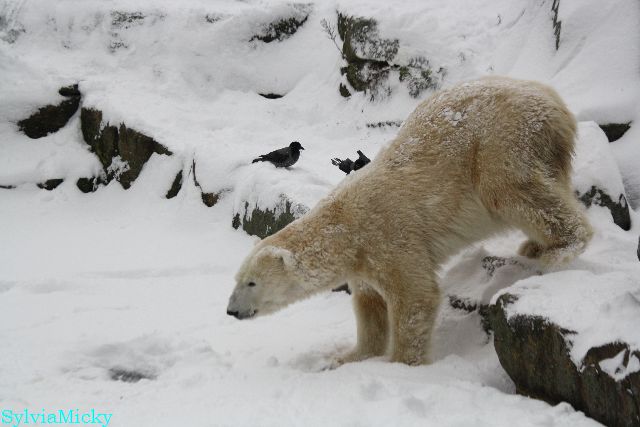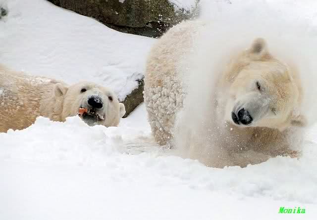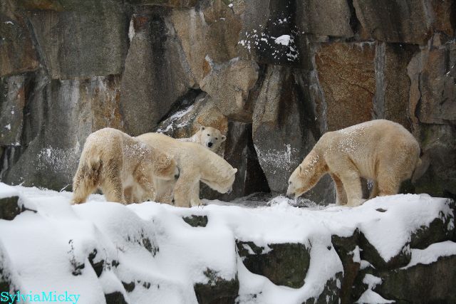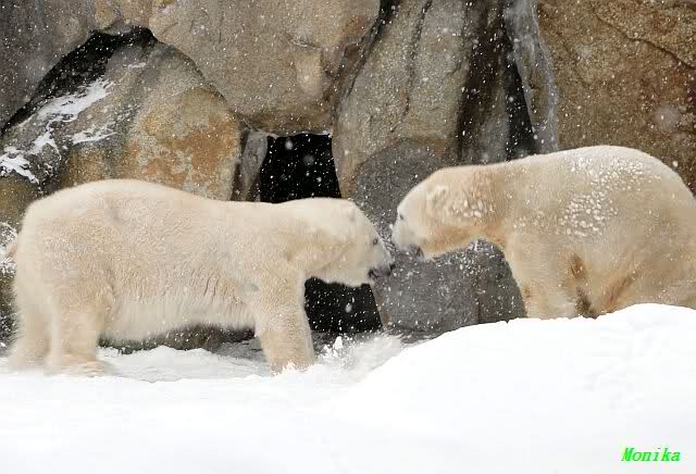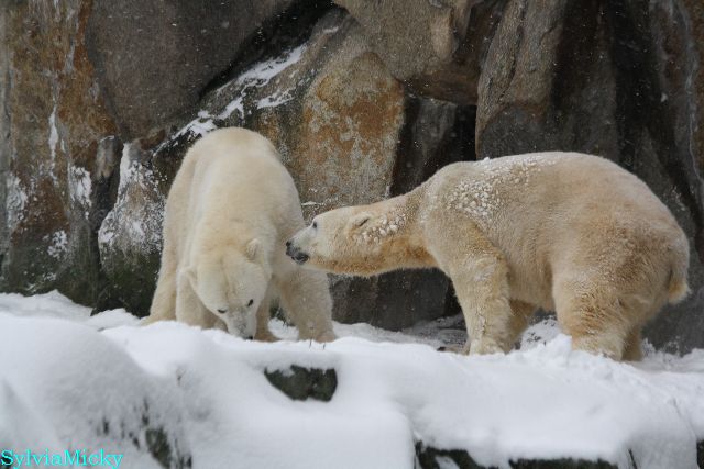 Richtiges Eisbärenwetter. Am meisten hat Tosca den Schnee genossen. Sie war für mich heute die Schneekönigin. Knut war doch etwas verhalten, allerdings gab es auch wieder eine Auseinandersetzung mit Kati. Das mußte er erst einmal verdauen.