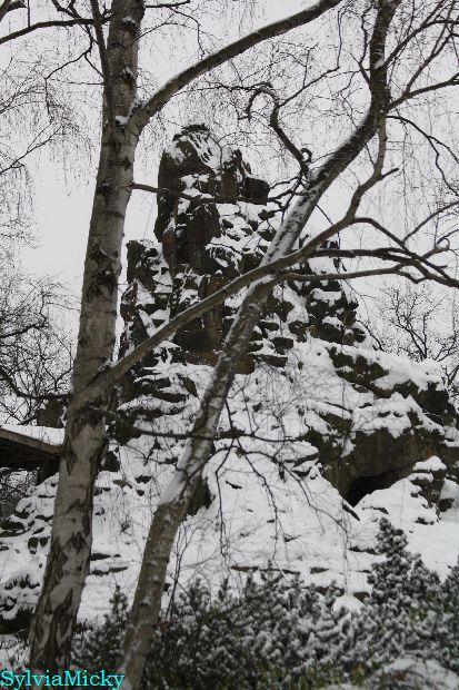 Aber ich sah ihn dann gleich auf seiner Ecke. Einmal erhob er sich halb, um sich ein wenig an dem beschneiten Felsen hinter ihm zu schubbern, einmal prustete er vernehmlich vor sich hin, als Kati in seine Nähe kam (Distanz:6m).