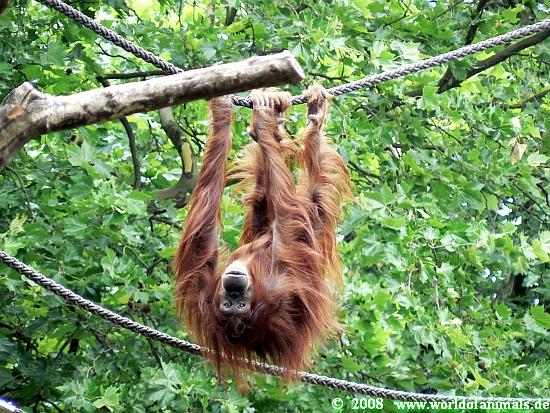 Überhaupt ist die Anlage sehr schön und auch groß, überall frischer grüner Rasen, es gibt viele Bäume und Stämme, Seile sind kreuz und quer gespannt und es gibt sogar eine Hängematte. Vor der Anlage ist eine Glasscheibe, so wie bei Knut, denn kommt ein flacher Wassergraben, dann der Maschendraht. Der ist hellgrau, also sehr unauffällig. Es stimmt übrigens, dass man dadurch gut fotografieren kann. Sogar mir sind recht gute Fotos geglückt. Die Motivwahl lässt allerdings zu wünschen übrig (u.a. Herr Opitz von hinten).