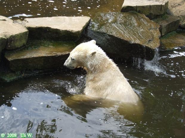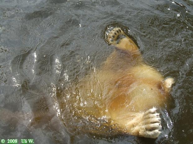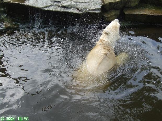 Dann ging es zurück zu Knut. Dort gingen die Überraschungen los. Knuti war erwacht und spielte im Wasser ganz entzückend mit seinem Fender oder jedenfalls einem Teil, dass dem ziemlich ähnlich sah. Er warf ihn ins Wasser, tauchte danach, biss immer wieder darauf herum. Er schleuderte das Ding so hoch, dass es gegen die Scheibe klatschte und wir – trotz Sicherheitsabstand – eine Dusche bekamen.