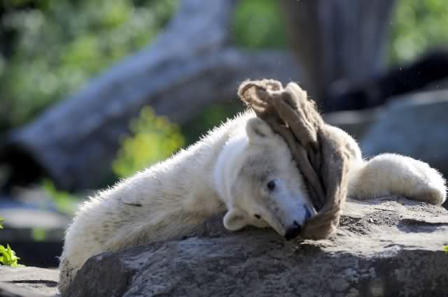 Knut sprang danach und riss das Laub ab. Das machte Knut so lange, bis das ganze Laub ab war. Das volle Trainings- und Bespaßungsprogramm. Den entlaubten Ast bekam Knut dann zum Spielen.