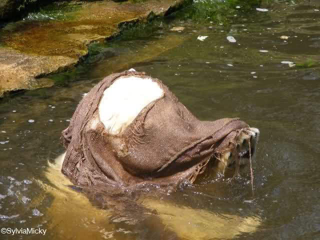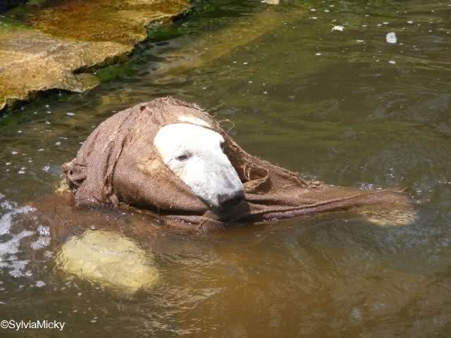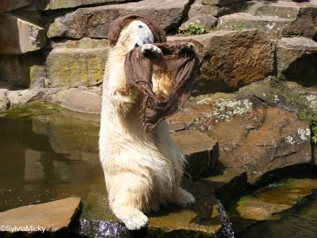 Ich war heute sehr früh am Zoo, so dass ich auf Einlaß warten musste. Als ich dann hinein durfte, ging ich zuerst zu Knut. Weil der aber gerade döste, drehte ich zum Seele-Baumeln-lassen die große Bärenrunde. Bei den Eisbären war zu so früher Stunde Putzen angesagt. Die Bären waren nicht zu sehen. Dafür aber Herr Röbke, der mit einem Wasserschlauch gründlich die Anlage reinigte. Die Malaien waren wohl noch verschlafen, sie dösten oben auf den Steinen.