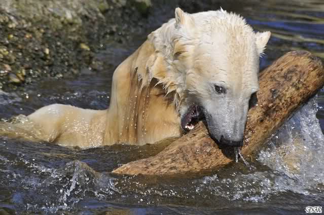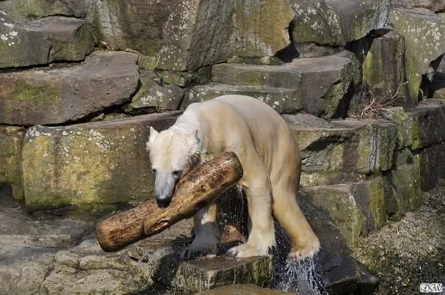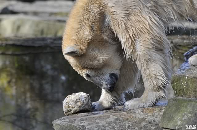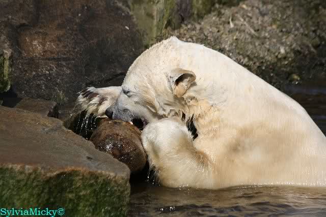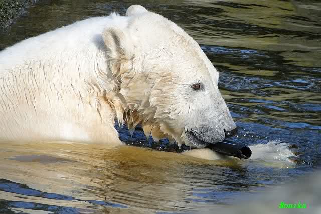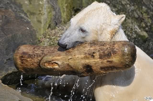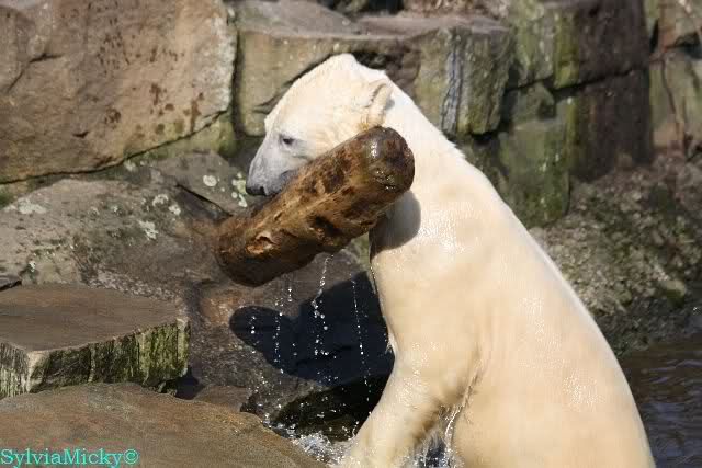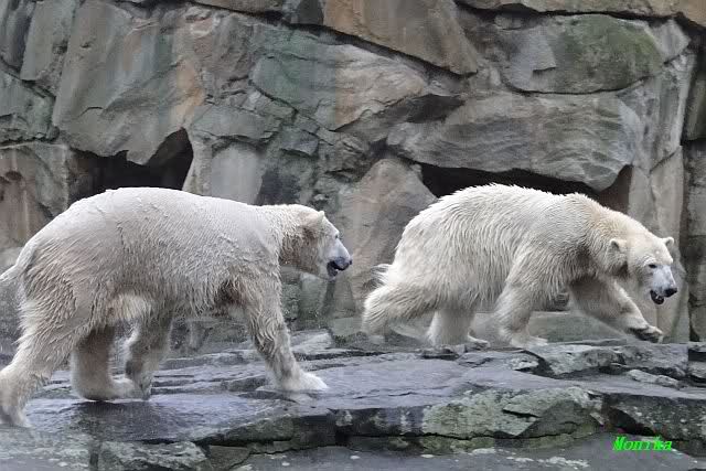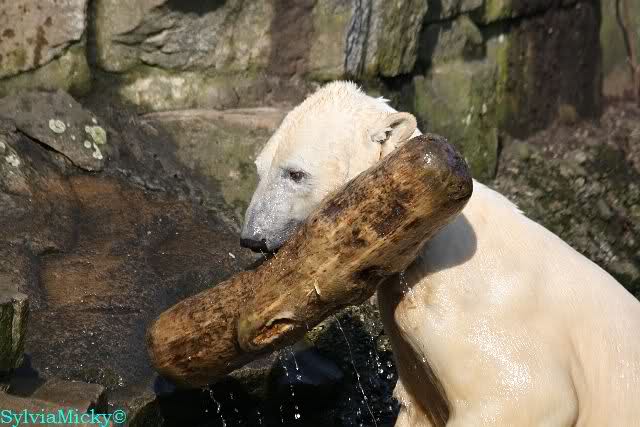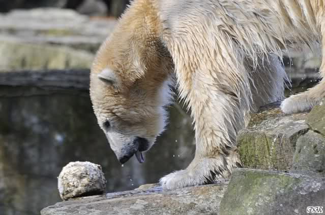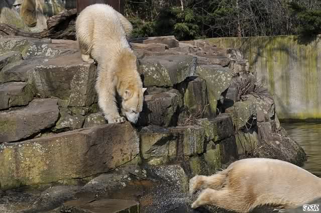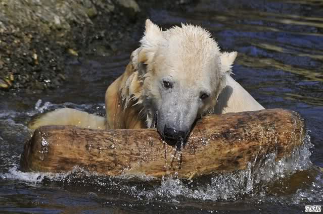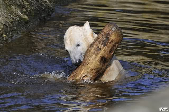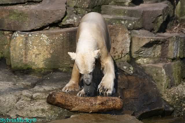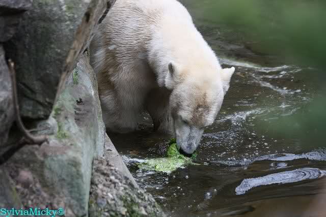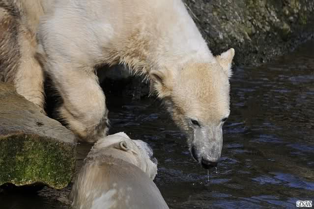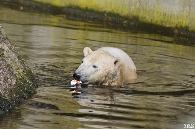 Knut und Gianna waren ebenfalls mobiler als in den letzten Tagen. Sie spielten abwechselnd mit den verschiedensten Dingen im Wasser. Mal war es Knut, dann wieder Gianna. Keiner ließ den anderen richtig aus den Augen. Immer wieder kam es zu Begegnungen der Beiden ohne jedoch das ausgelassene Spiel der vergangenen Wochen zu zeigen. Knut fängt seit ca. einer Woche sehr früh an zu laufen. Gegen 12.00 Uhr scheint sein Magen zu knurren. Selbst nachmittags ab spätestens 15.00 Uhr läuft er wieder, ab und zu unterbrochen von kleinen Schnäbeleien.