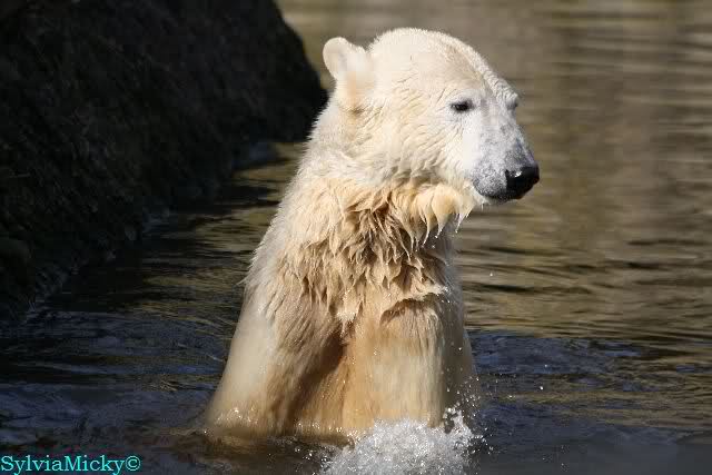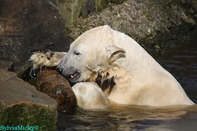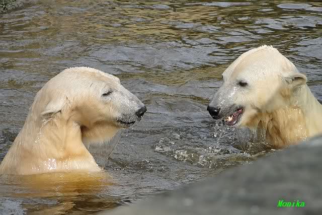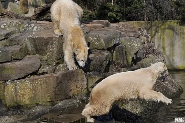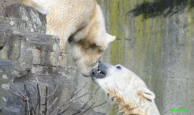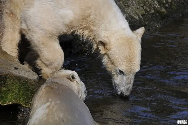 Heute Morgen lag Knut auf dem "Sandhaufen" und buddelte . Das fand Gianna natürlich interessant und ging gucken was er da so macht. Schon waren beide munter und es wurde geschmust. Knut ging dann ins Wasser und schwamm ruhig seine Bahnen, wie ein U-Boot. Gianna kam ab und zu runter und sucht Kontakt. Irgendwann ging sie dann auch ins Wasser und sie tobten gemeinsam. Kurzes Tauziehen mit dem Nackthuhn gab es auch.