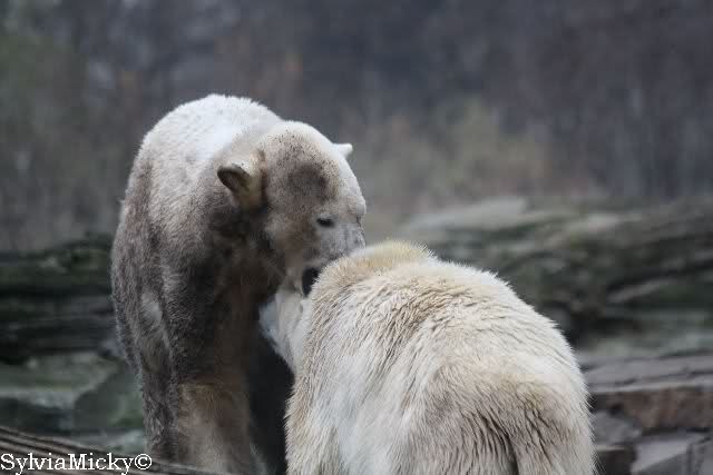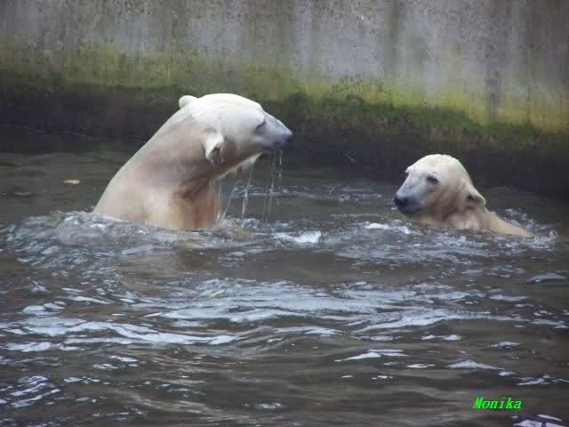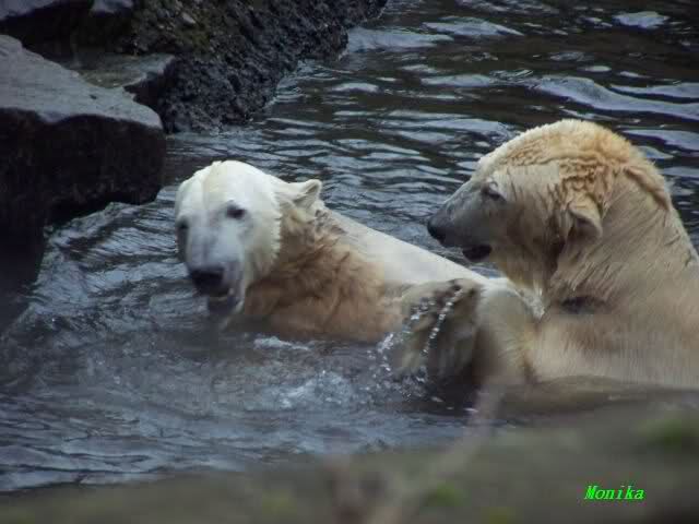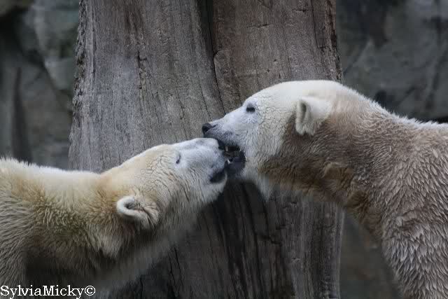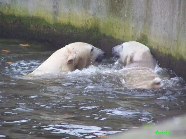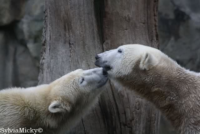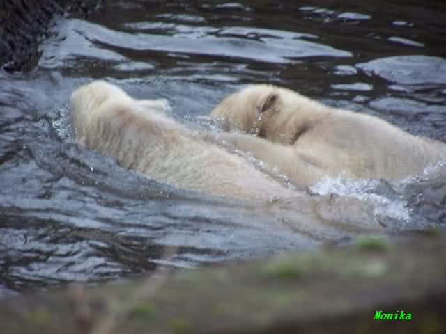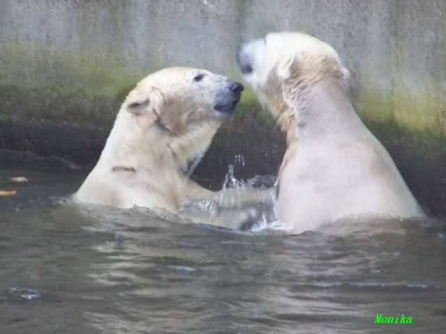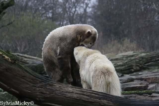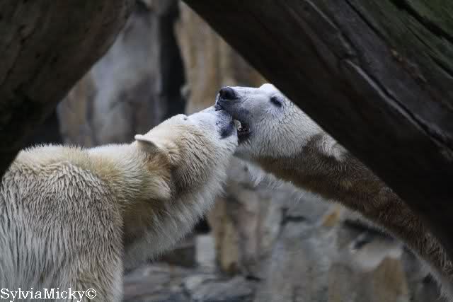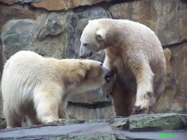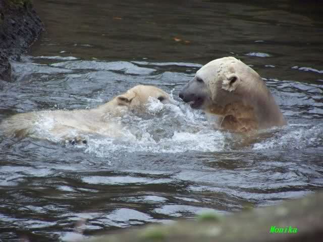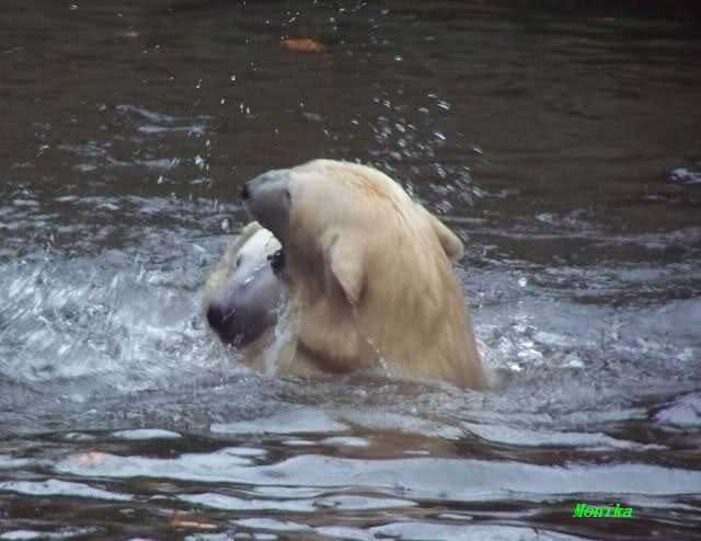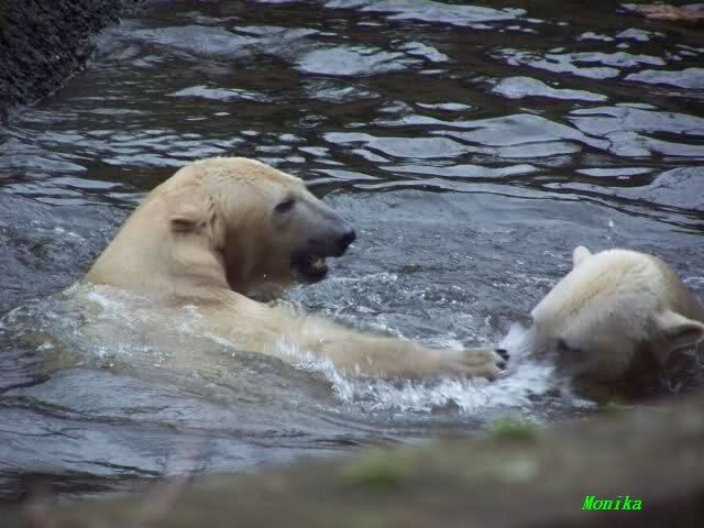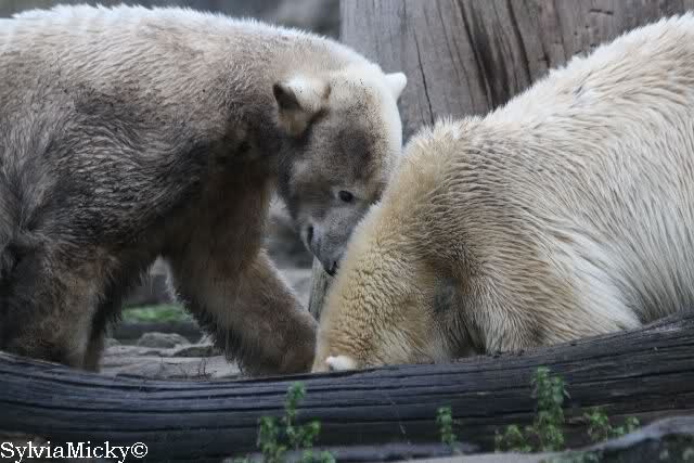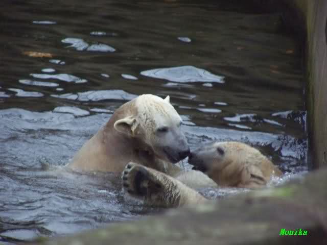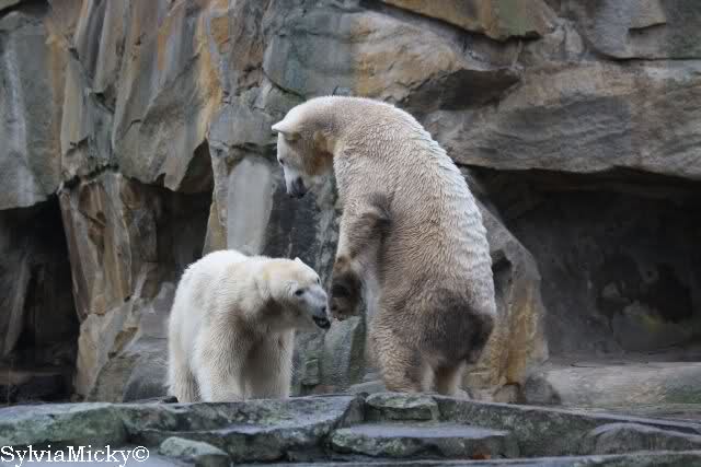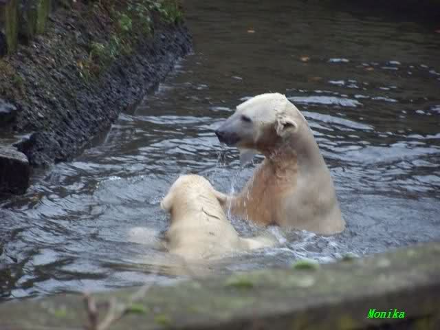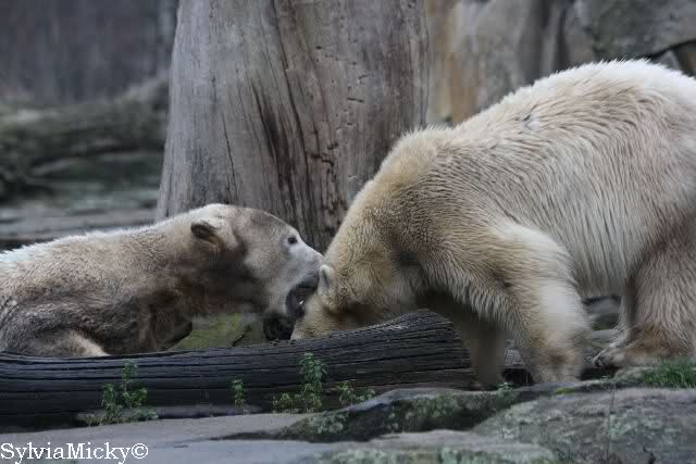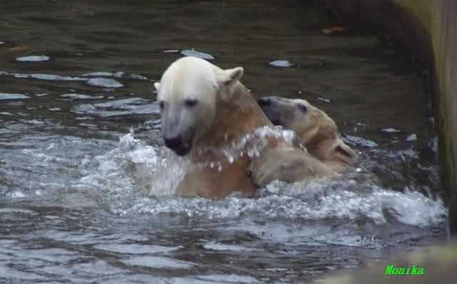 Wieder ein weiterer Schritt für Knut und Gianna. Als ich heute Morgen um 9.00 im Zoo ankam, spielten die Beiden bereits miteinander im Wasser. Gianna sprang auf Knut und tauchte ihn unter Wasser, aber auch umgekehrt. Sie tollten ausgelassen noch 1/2 Stunde. Anschließend wurde auf der Anlage auch noch ab und zu gebusselt, und Knut zwickte Gianna öfters in den Po.