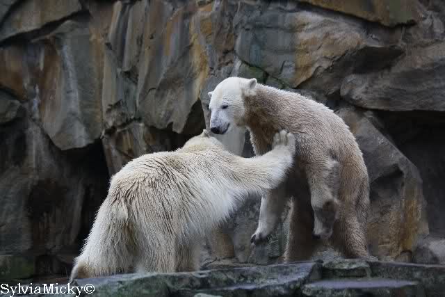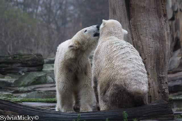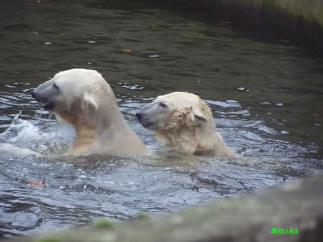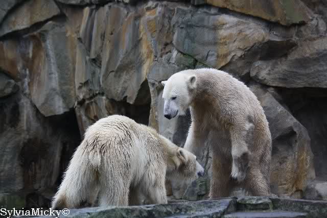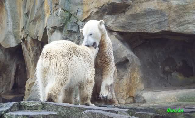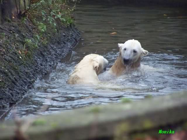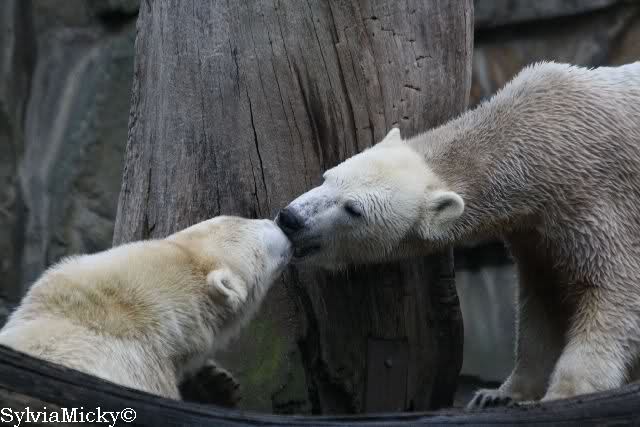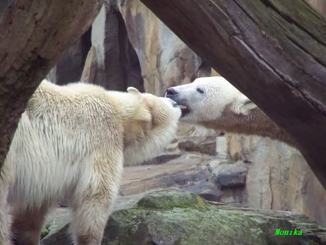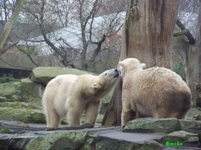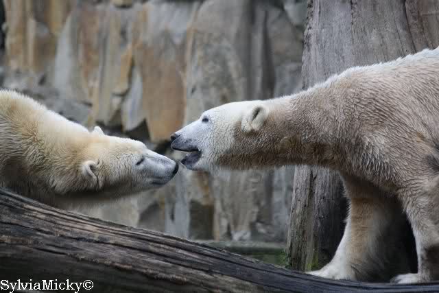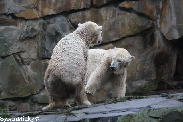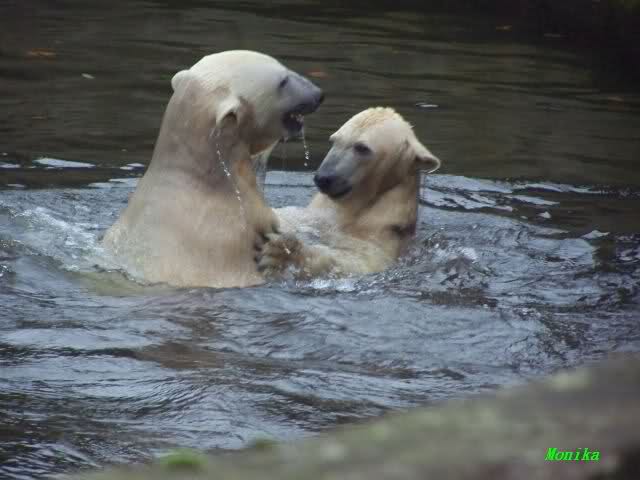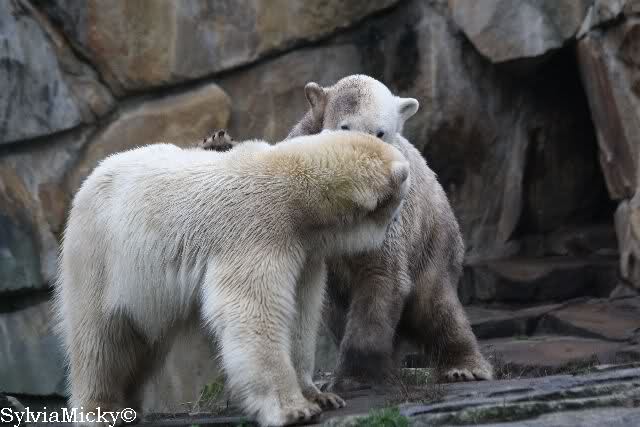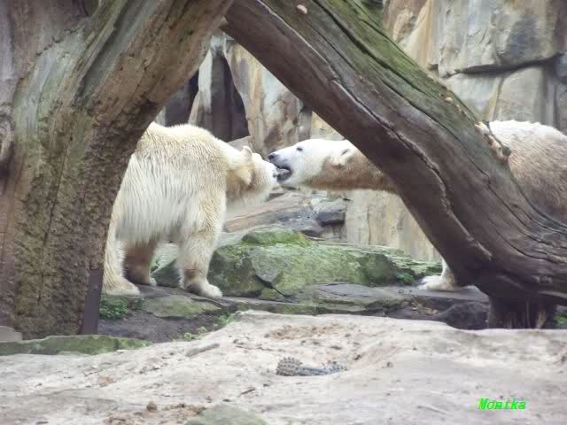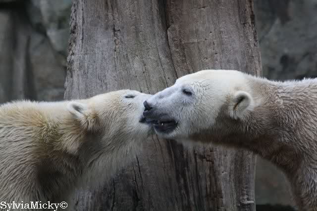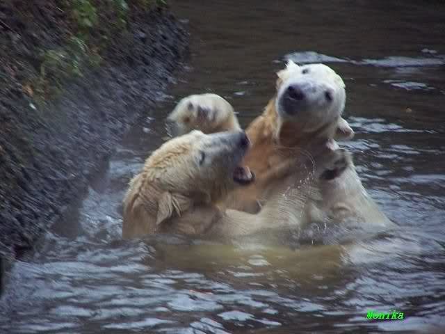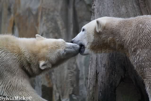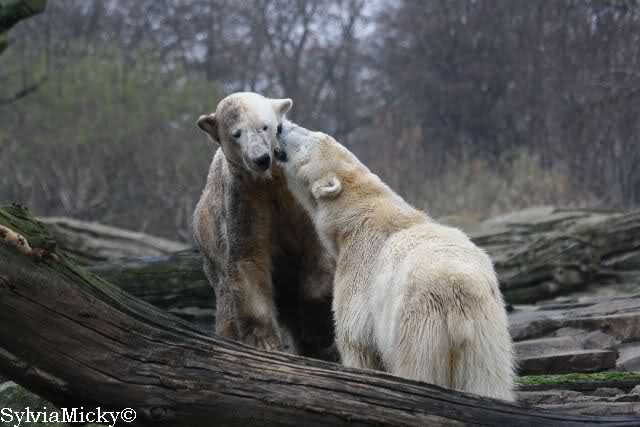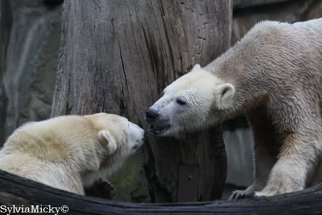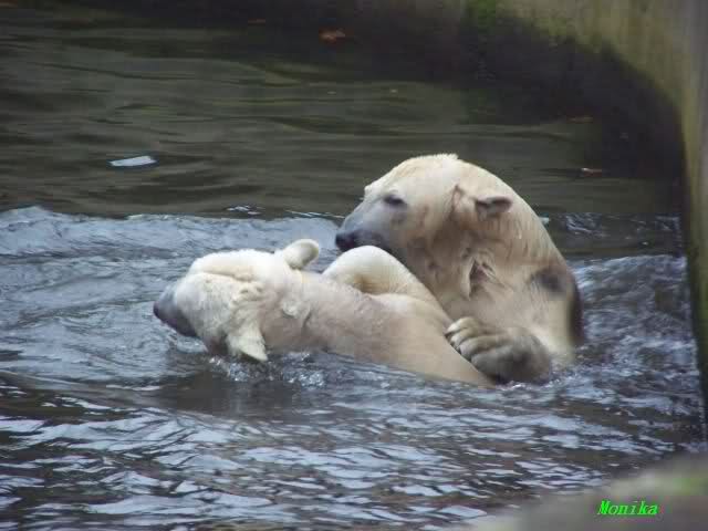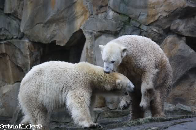 Wieder ein weiterer Schritt für Knut und Gianna. Als ich heute Morgen um 9.00 im Zoo ankam, spielten die Beiden bereits miteinander im Wasser. Gianna sprang auf Knut und tauchte ihn unter Wasser, aber auch umgekehrt. Sie tollten ausgelassen noch 1/2 Stunde. Anschließend wurde auf der Anlage auch noch ab und zu gebusselt, und Knut zwickte Gianna öfters in den Po.