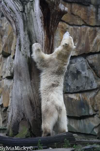 Aber auch ich bekam noch allerlei Schönes von Knut und Gianna geboten. Knut machte schöne Posen um Gianna zu beeindrucken. Er stellte sich auf die Hinterbeine und reckte den Hals, als wolle er sagen: „Guck doch mal, Gianna, bin ich nicht ein schöner Bärenjunge?“