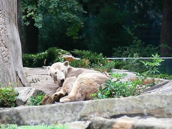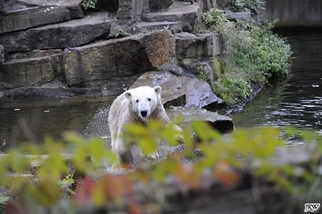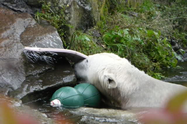 If you will discover a strange green and white kind of "plant" on pics of Nuuti's enclosure, it's called 'it's not a toy'. Some of you have catered for the "seeds". Won't get any bolder, just in case... As I heard, our beloved bear is checking out possible applications for this "plant of orbs" ( baby pumpkins? ) Knut even tried whether it was destroyable. It isn't. Yet.