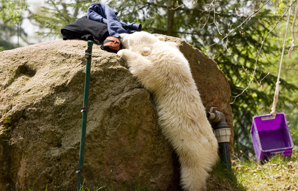 15. Mai 2008: Vor Flockes neugieriger Nase ist nichts sicher. Sie hat zwar etwas Mühe, an den Fotoapparat des Wächters heranzukommen, aber mit ein bisschen Strecken klappt das. Da hat die Pflegerin die kleine Eisbärin glatt unterschätzt, als sie Jacken und Fotoapparat auf dem vermeintlich hohen Felsen abgelegt hat. (Foto: Ralf Schedlbauer)