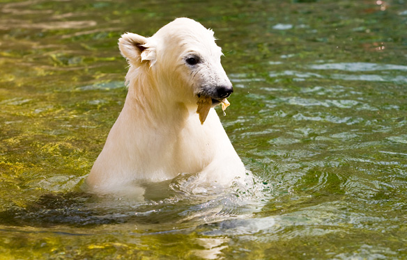 Flocke hat wirklich viel zu tun. Ständig werfen die Pfleger irgendwelche interessanten Sachen ins Wasser. Ob Eimer, Bälle oder dicke Äste – alles wird an Land gezerrt und gründlich untersucht. (Foto: Ralf Schedlbauer)