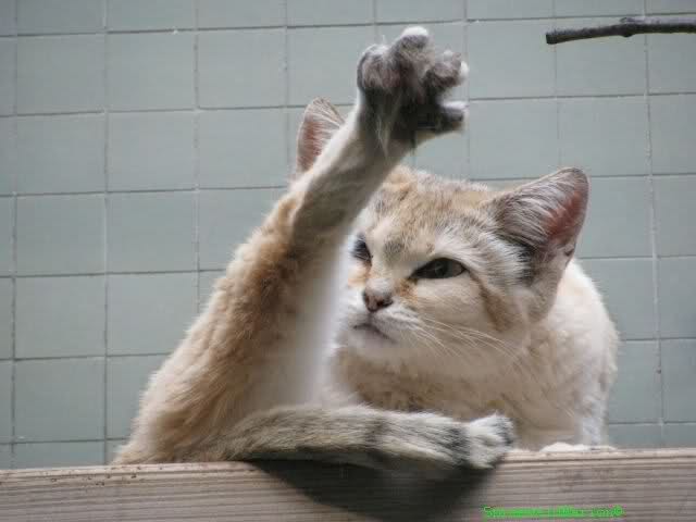ist das ein süßes Bild von der Sandkatze! Diese Haltung kommt jedem Katzenbesitzer bekannt vor.