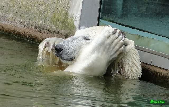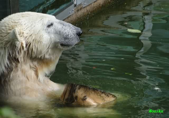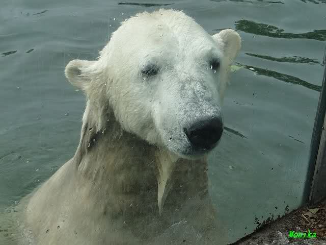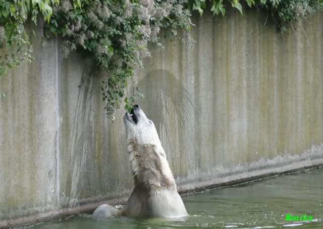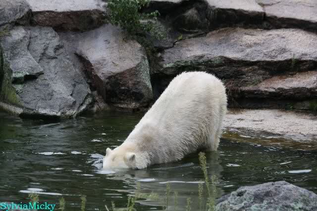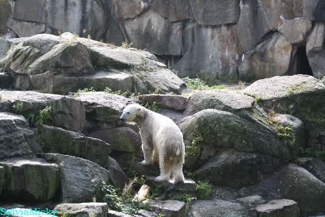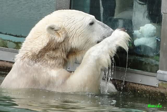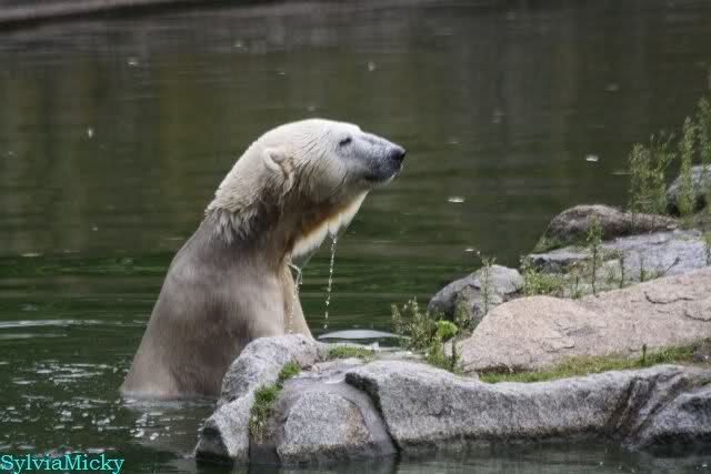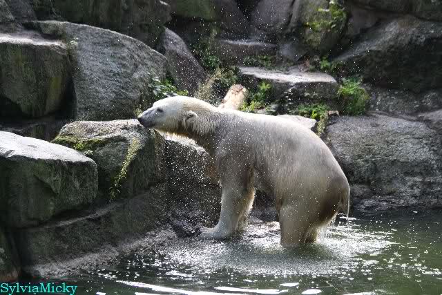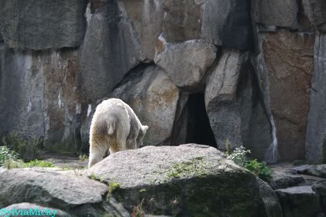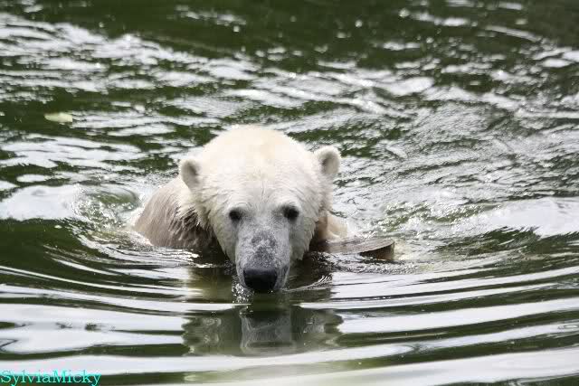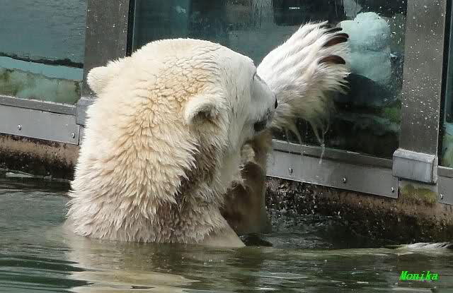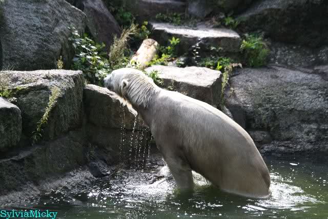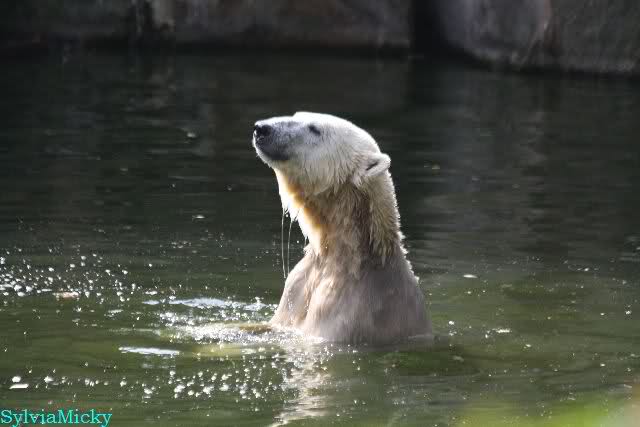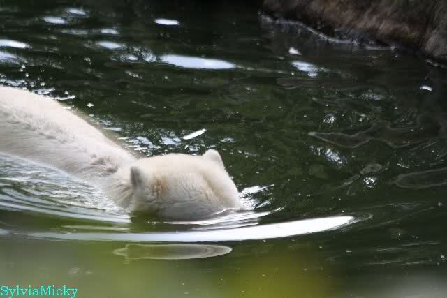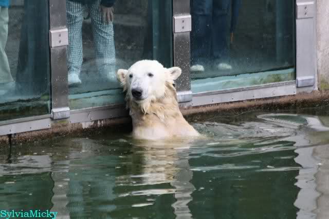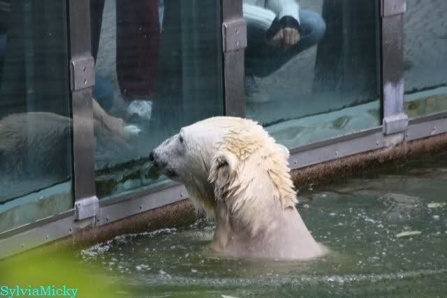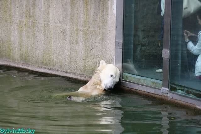 Very important note from Sylvia: some people are knocking on the glass with rings and hands and so, and as in former times, these noises make Knuti jump high again (what kind of idiots!!!). Maybe, the Zoo Management should install a sign with the request “please do not knock on the glass”, both in English and German.