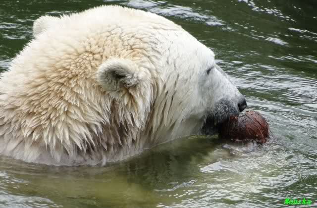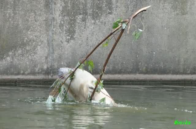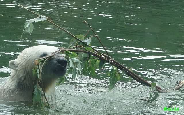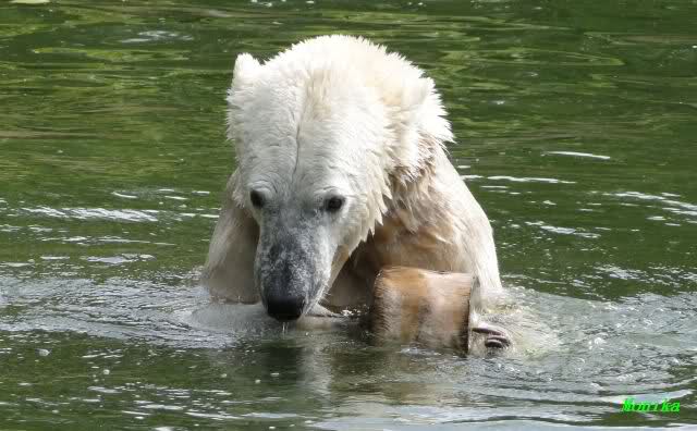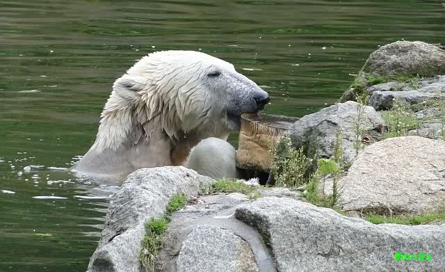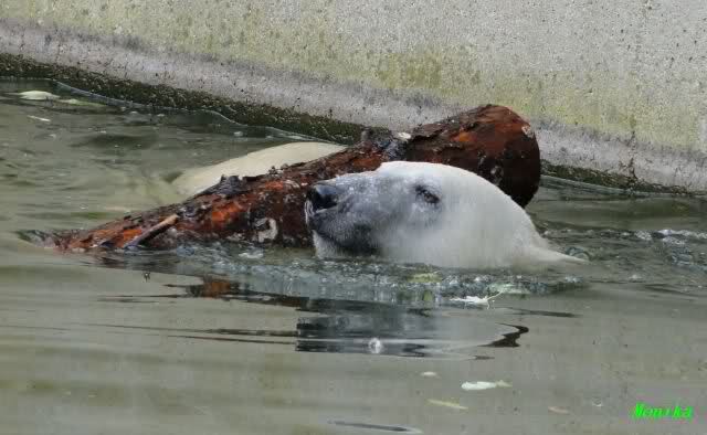 Knut arrived only at about 9.30 h at the enclosure because of cleaning works. He left his cage rather quickly but is still walking very carefully over the rocks (but apparently no longer like “walking on ice”). Of course, everything needed to be checked and re-checked again. According to Sylvia, a sand heap will help him to feel more comfortable (my personal comment: I agree, and if not sand, then maybe wood chips). Thereafter, he has been playing for about 3 (!!) hours in the water, an element in which he is feeling very good. There, he also found the leftovers of a chewing bone that is looking like a piece of leather (of course, he is familiar with this stuff and its looks). There was also some playing with the big twig and efforts were made to catch branches. And also, a coconut was one of the found treasures. Then Mr. Henkel arrived and throw a big wood slice with which he has been playing quite a long time. He has also been swimming around the little islands, but did not climb on them. And of course, he came often to the glass shield, much to the great pleasure of his visitors. A wee girl said that he is still a baby who wants to play (personal note: as we say in Dutch: de waarheid is in de kindermond). A couple from Hessen were having little polar bears in their bag and placed them at the shield. Knuti tried to get them and according to Sylvia, it might help to give him some of his old toys, because they are known to him.