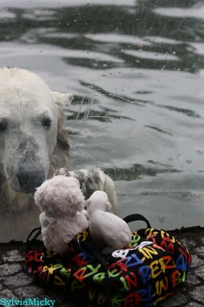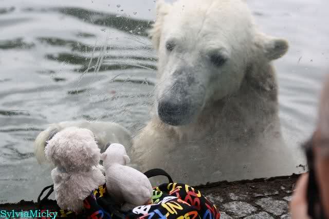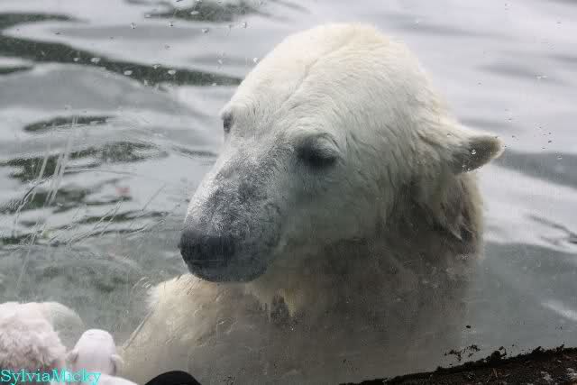 Ein nettes Ehepaar aus Hessen hatte kleine Eisbären in der Tasche. Sie stellten die Tasche an der Scheibe ab und Knut versuchte mit der Pfote die Eisbären zu erreichen. Er ist noch sehr verspielt, deshalb wäre es so wichtig ihm seine Spielzeuge zu geben. Es wäre etwas Vertrautes.