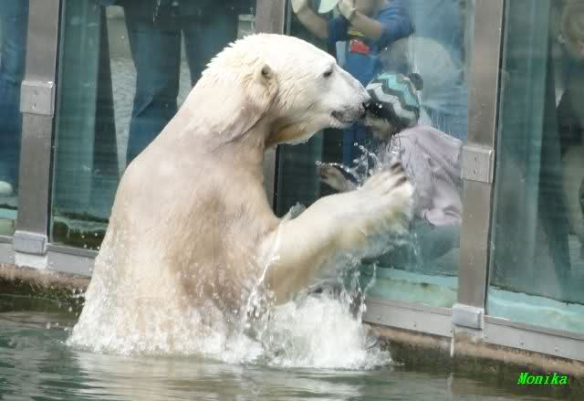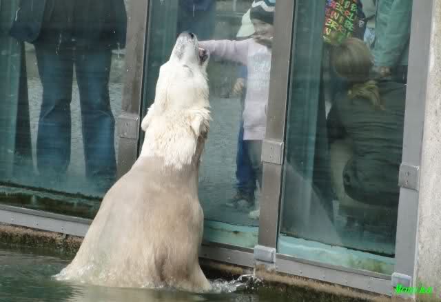 Was mir nicht gefällt, ist das es Besucher gibt, die mit Ringen oder anderen Gegenständen oder Händen an die Scheibe klopfen. Knut springt dann immer an der Scheibe hoch. Vielleicht wäre es der Zooleitung möglich zwei Schilder auf Deutsch und Englisch anzubringen. „Bitte nicht klopfen“