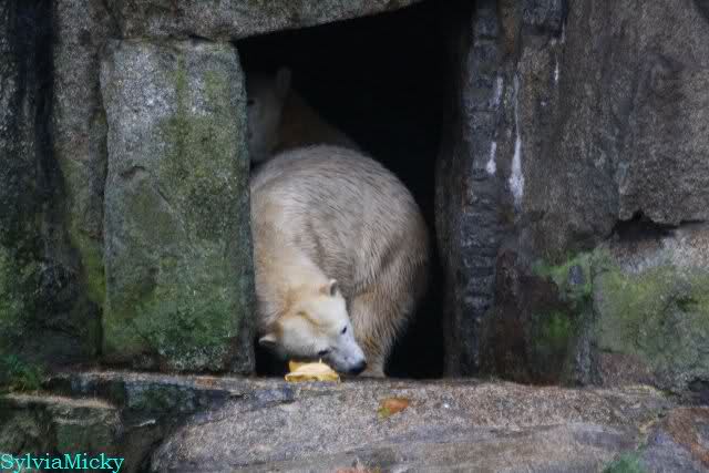 Mini-Besuch bei Knut und Co. Knut wartete mehr oder weniger geduldig, dass er die Anlage für sich allein haben würde. Tatsächlich wurden die Mädels relativ früh von der Anlage genommen. Knut inspizierte alles. Natürlich auch Kati's Höhle. Was fand er? den Ball, den gestern eine "Dame" lauf schreiend hineingeworfen hatte. Sie ist nicht oft im Zoo, aber wenn sie da ist, macht sie immer ein Spektakel. Im letzten Sommer musste sie von Herrn Zahmel davon abgehalten werden Futter zu Knut zu werfen. Sie hatte schon tagsüber immer wieder Dinge in den Graben geworfen. Immer schreiend und wenn sie angesprochen wurde, war sie unglaublich ausfallend. Herr Zahmel hatte seine Mühe mit ihr und erst als die Bärenpfleger dazu kamen, konnte sie überwältigt und des Zoos verwiesen werden. Sicherlich meint sie es nicht schlecht, aber belehrbar ist sie auch nicht. Nun also ein Ball, der sehr schnell kaputt war. Man kann immer wieder nur an den Zoo appellieren, endlich den vier Bären das tiergerechte Spielzeug zu geben. Nur so werden sich Leute nicht gemüßigt fühlen, den Bären zu "helfen". Dass die Tiere Abwechslung brauchen, ist wohl kein Geheimnis.