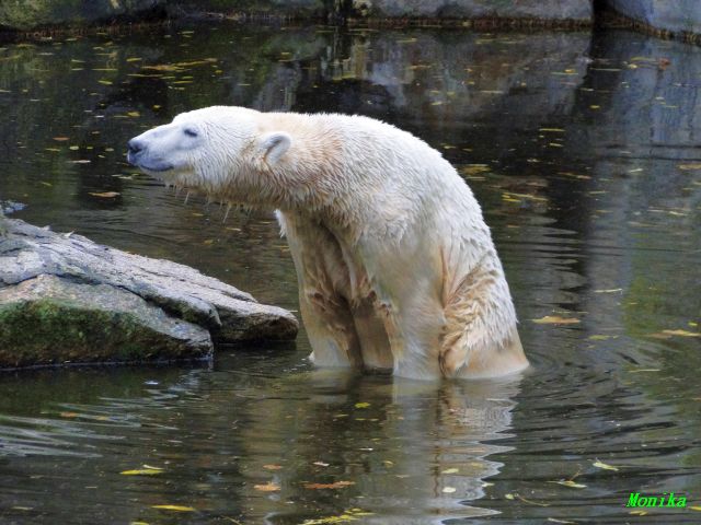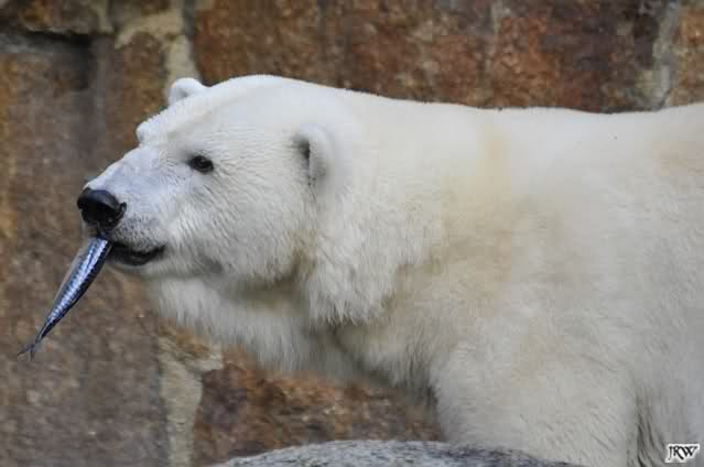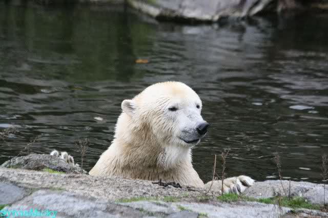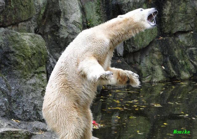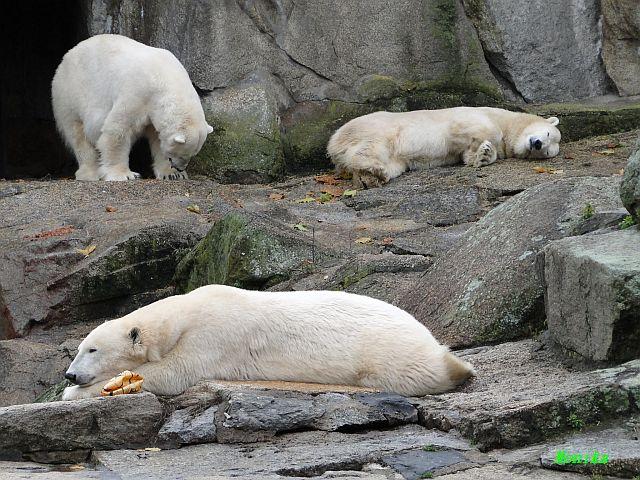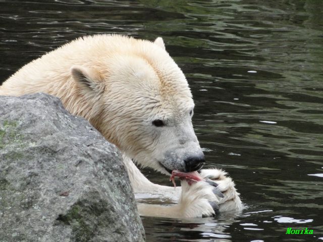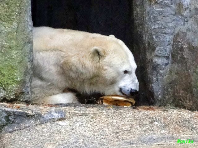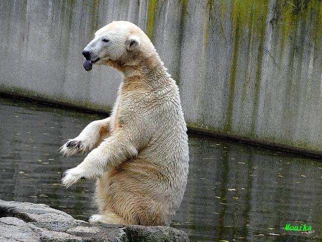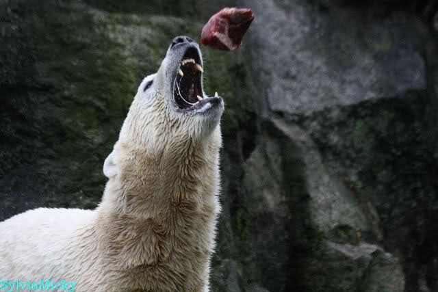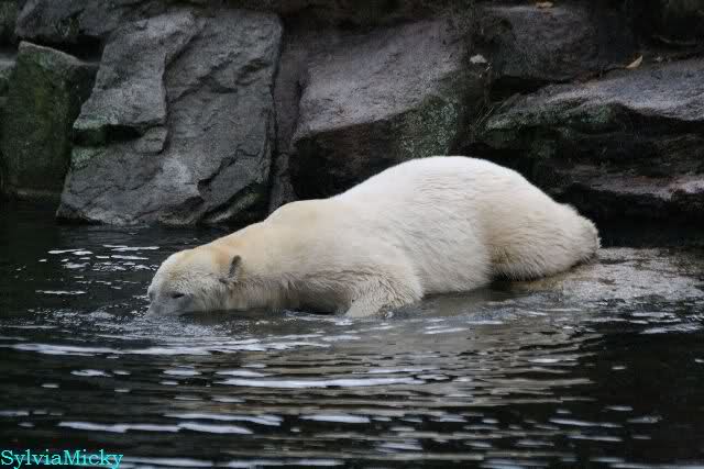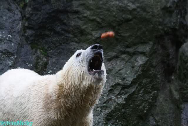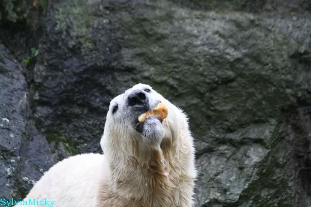 Gefüttert wurde er auf der hinteren rechten Seite. Knut hat etwas zugenommen. Kann aber noch einige Kilos zulegen. Nach der Fütterung wollte er mehrere Male auf die Anlage aber als er die Drei sah, ging er wieder runter und legte sich auf die hintere Ecke. Etwas später wollte er auf die vordere Ecke, da schwamm Tosca aber im Wasser. Also ging er wieder nach hinten.