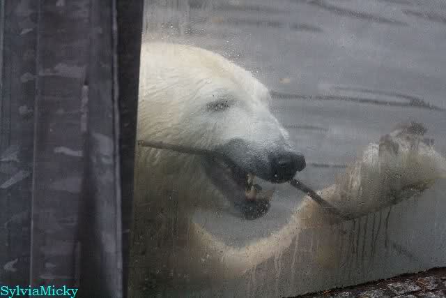 Heute früh war Knut im Wasser. Er spielte mit einem Shirt und einem Stock. Er war auch wieder an der Scheibe. Dort waren aber noch keine Besucher. Knut schaute ziemlich verdutzt.
