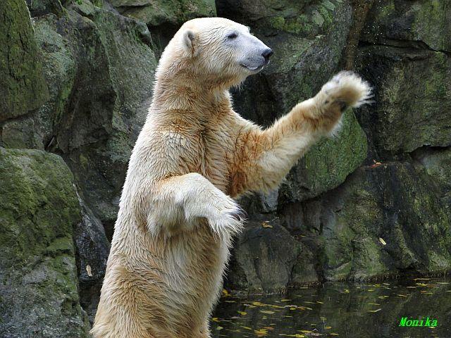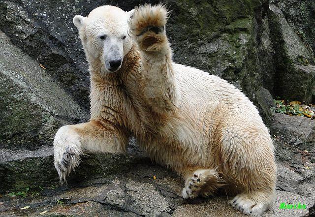 während Knut auf die Fütterung wartet, winkte er den Besuchern zu.