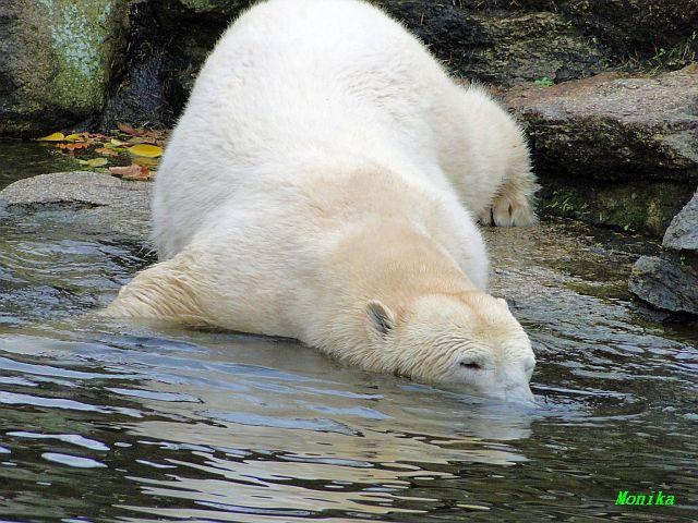 Während Knut auf der Seite lag, versuchte Tosca auf ungewöhnliche Weise ins Wasser zu geolangen