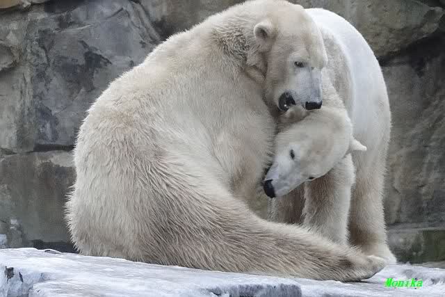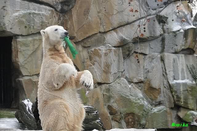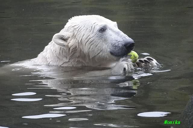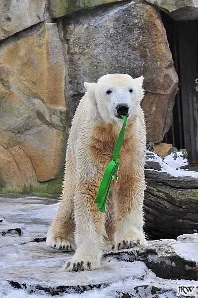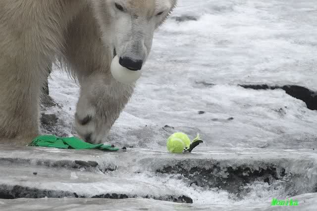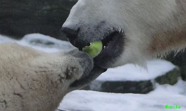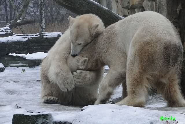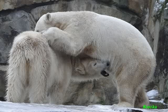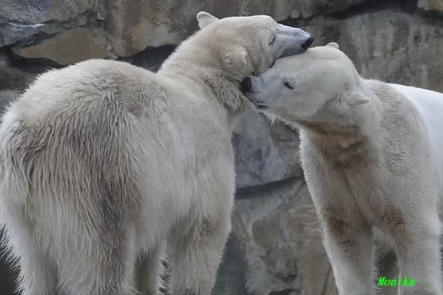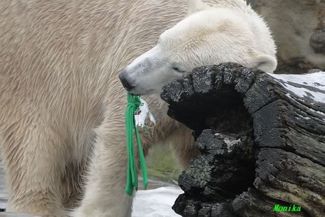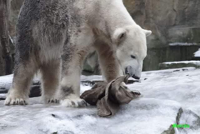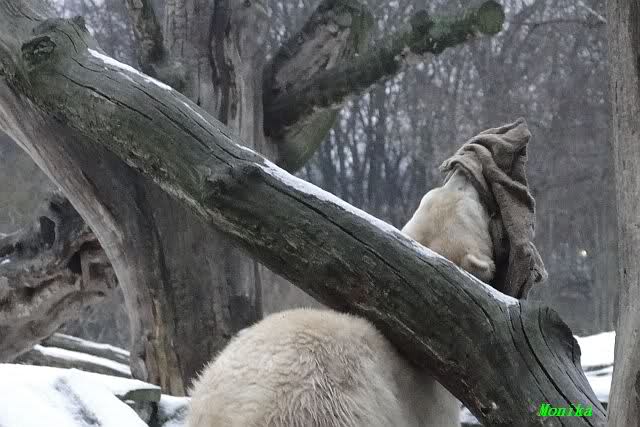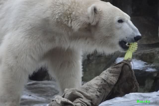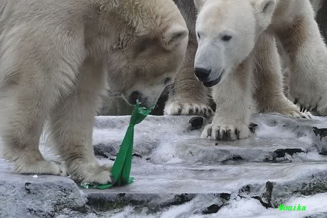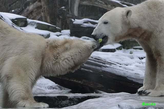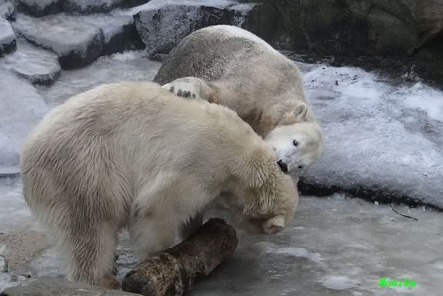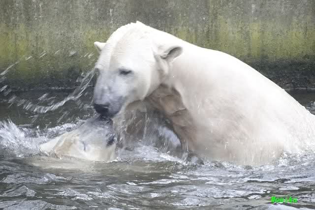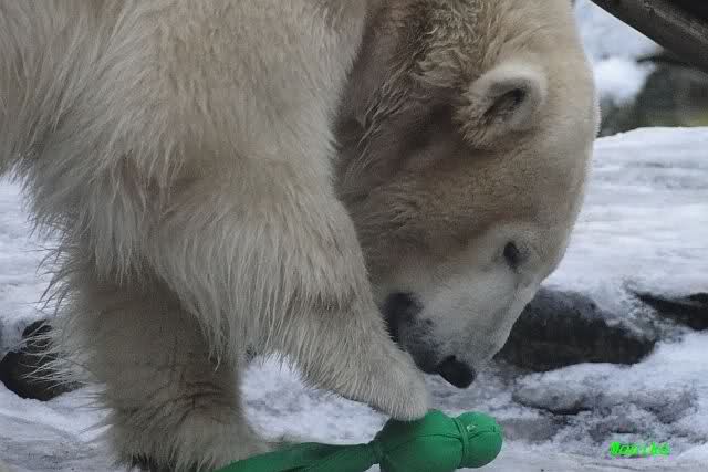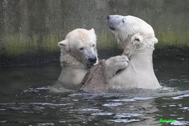 Es war ein schöner Vormittag im Zoo mit vielen Knut-und Giannafreunden, bei Sekt, Plätzchen und Kaffee. Die beiden Bären waren in Hochstimmung. Es wurde viel geschmust und gespielt. Gianna kam mit einem neuen Jutesack auf die Anlage, der mit einer Hantel gefüllt war sowie einem Plastikteil mit 2 Bällen drin. Wie es nun mal Giannas Art ist, zerfetzte sie alles in Sekundenschnelle und warf die Reste ins Wasser. Sie tobten auch wieder ausgiebig im Wasser.