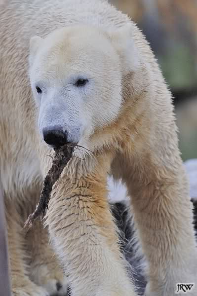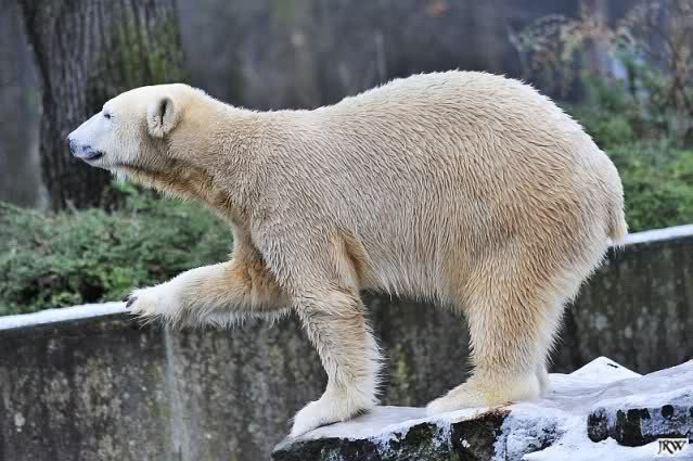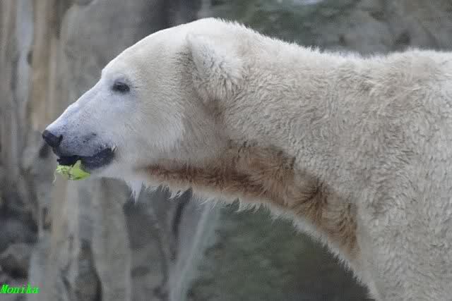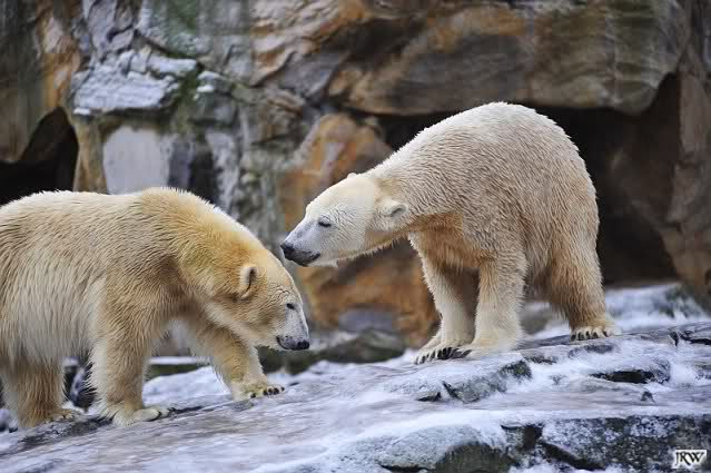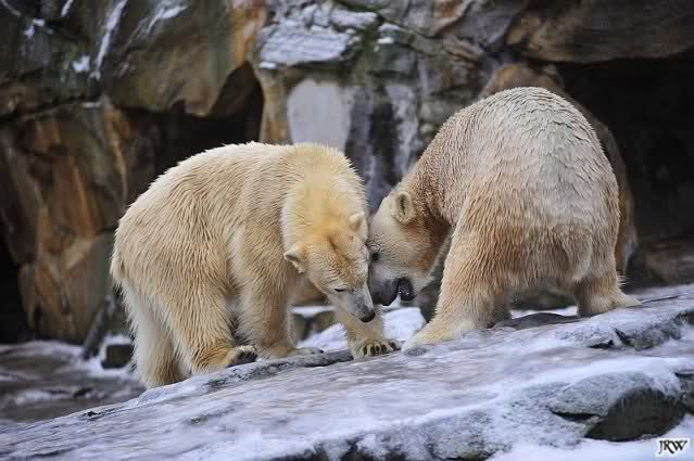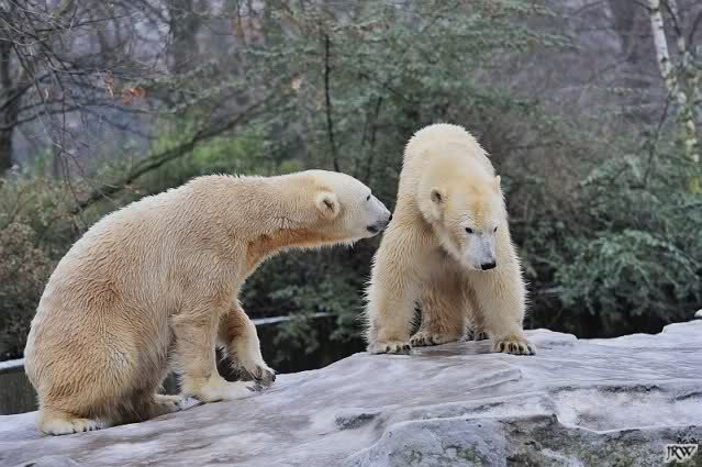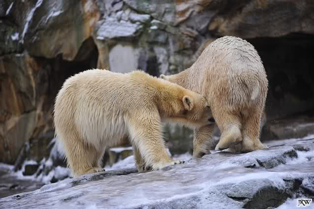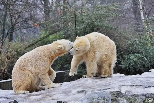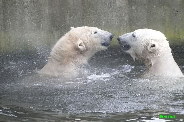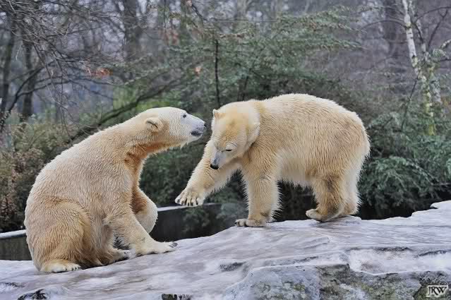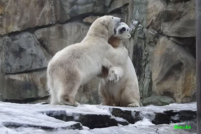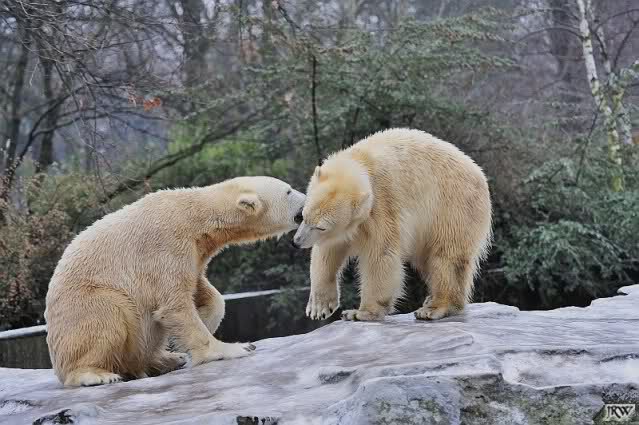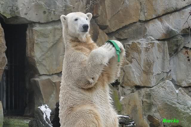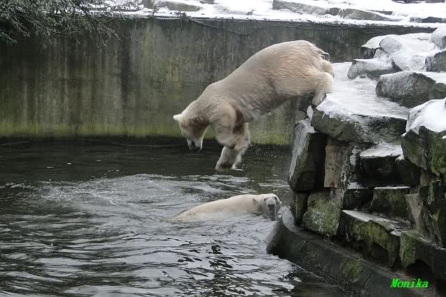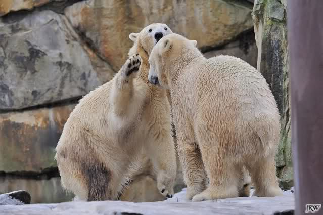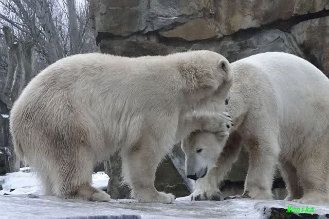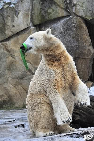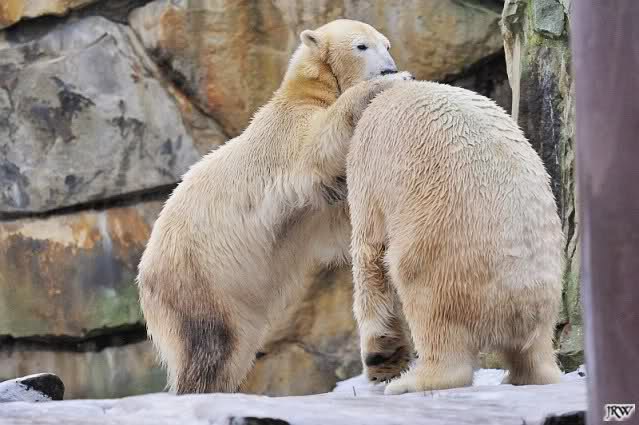 Es war ein schöner Vormittag im Zoo mit vielen Knut-und Giannafreunden, bei Sekt, Plätzchen und Kaffee. Die beiden Bären waren in Hochstimmung. Es wurde viel geschmust und gespielt. Gianna kam mit einem neuen Jutesack auf die Anlage, der mit einer Hantel gefüllt war sowie einem Plastikteil mit 2 Bällen drin. Wie es nun mal Giannas Art ist, zerfetzte sie alles in Sekundenschnelle und warf die Reste ins Wasser. Sie tobten auch wieder ausgiebig im Wasser.