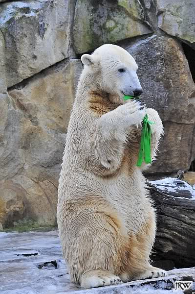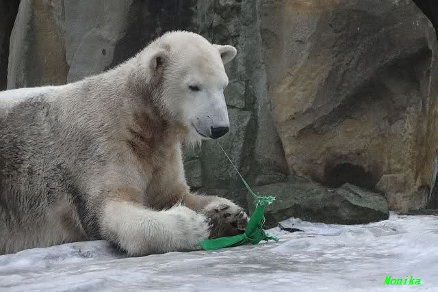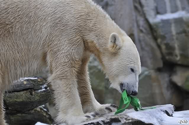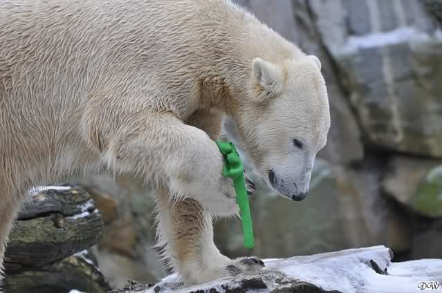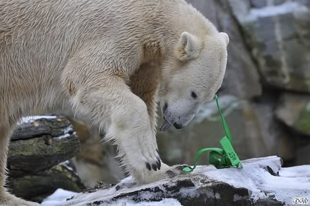 Knut hat Spaß mit dem grünen Teil, das inzwischen wie Geschenkband aussieht. Passend zu Weihnachten.