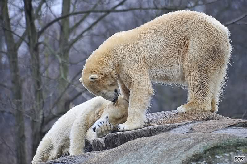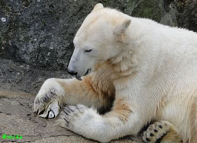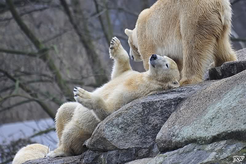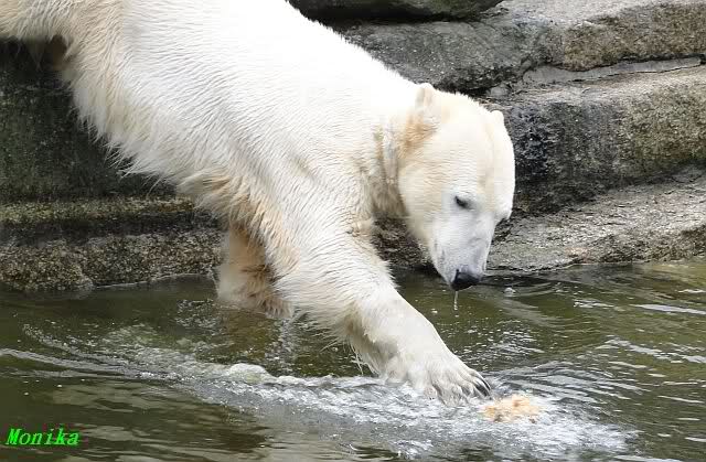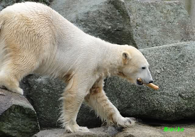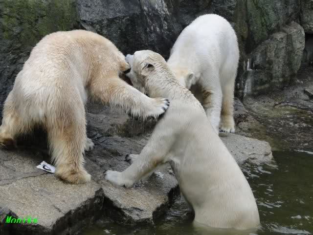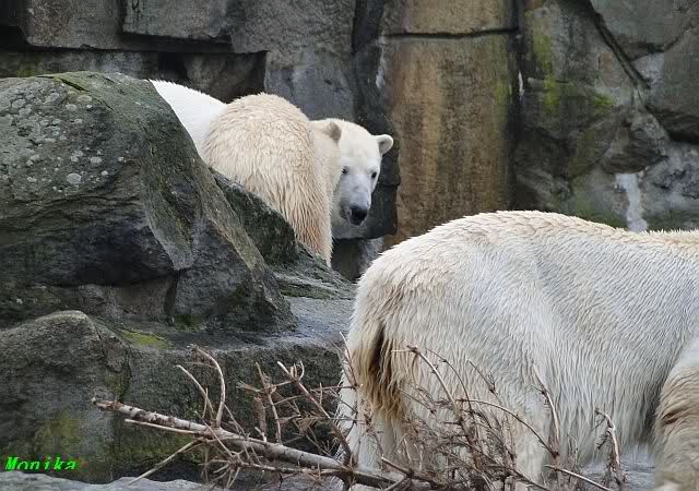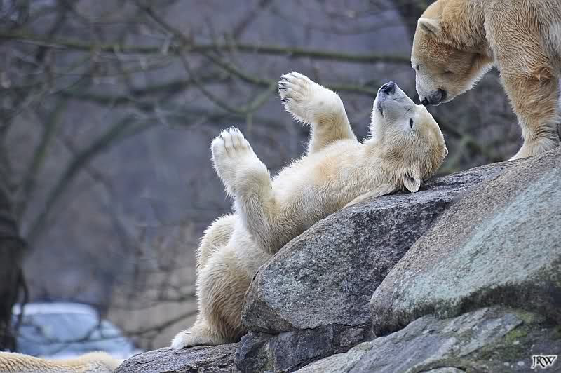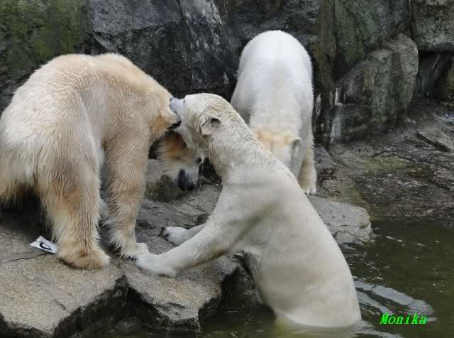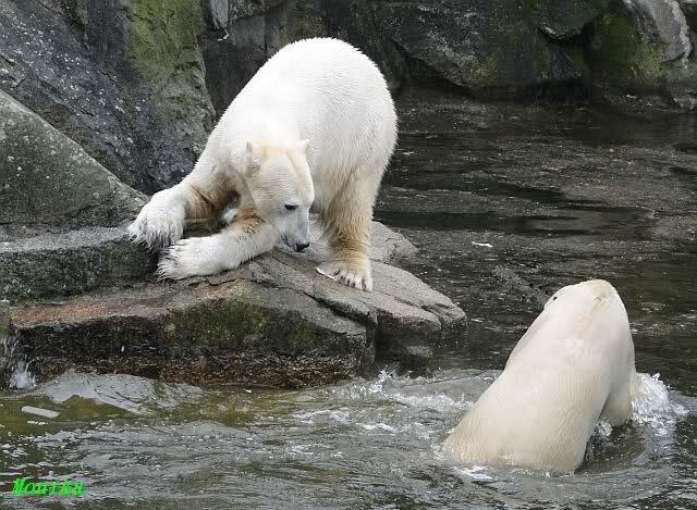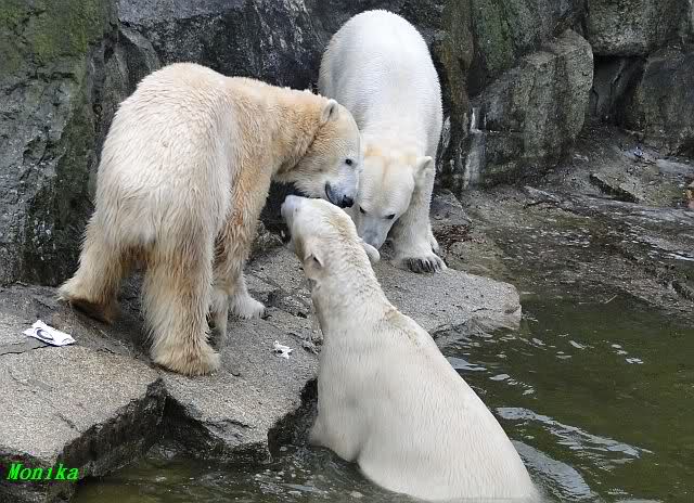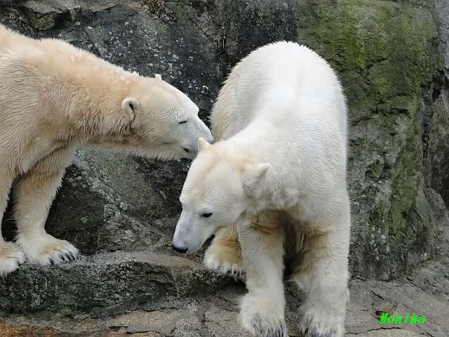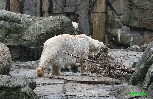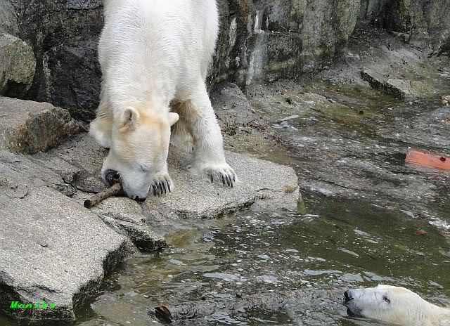 Als Knut einen Spaziergang auf der Anlage unternahm, lauerte Katjuscha schon um ihn zu jagen. Ich stand leider auf der verkehrten Seite und konnte die Beiden nicht sehen. Nur das Brummen war nicht zu überhören. Andere Knutfreunde erzählten mir, dass Nancy sich zwischen Knut und Kati stellte und auch etwas brummte. Kati ist dann gegangen. Das soll sie gestern schon einmal gemacht haben. Siieht ganz so aus, als ob Nancy auch so eine Art "Mutterrolle" für Knut übernommen hat.