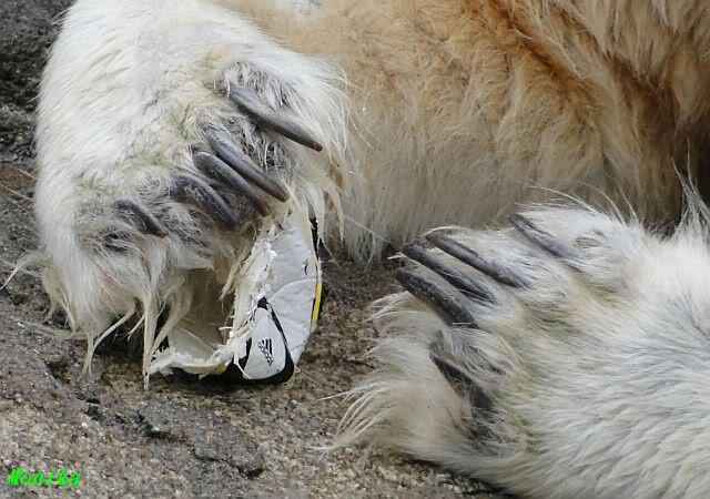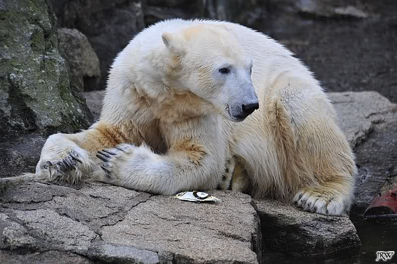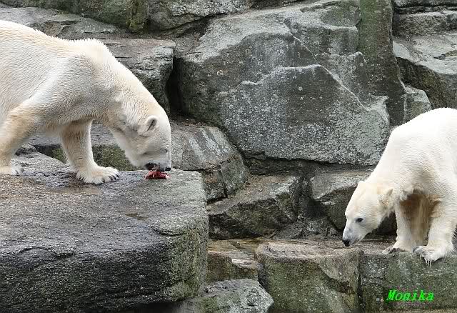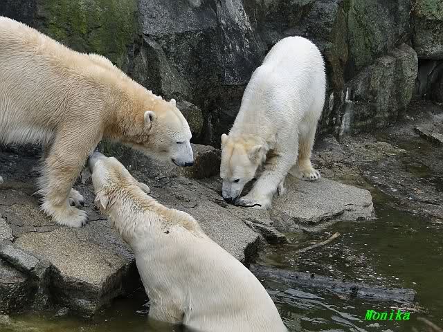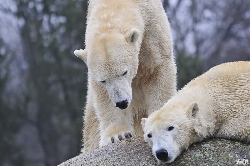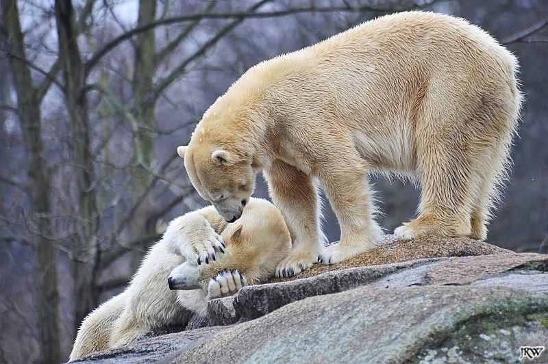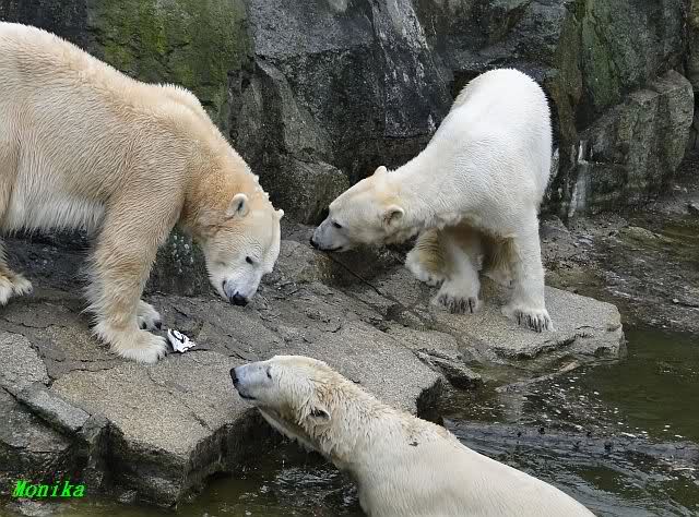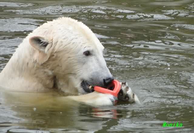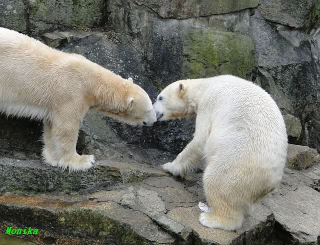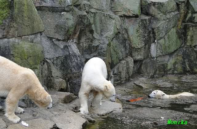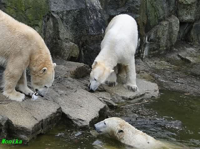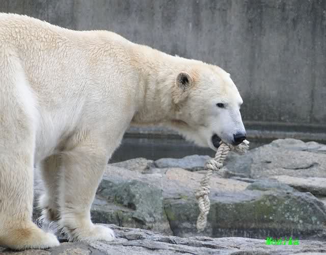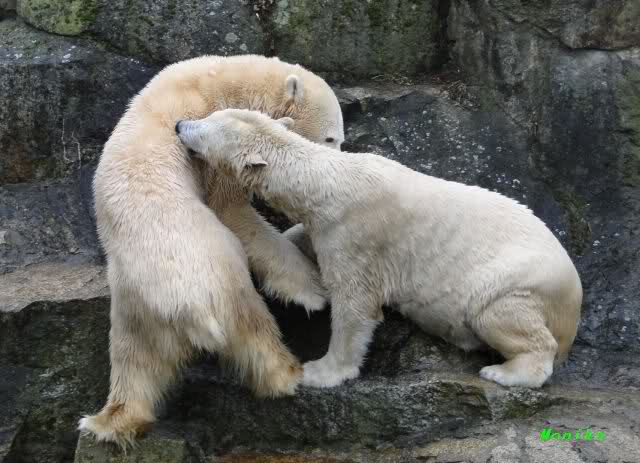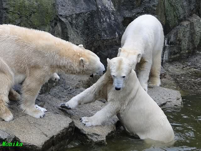 Als Knut einen Spaziergang auf der Anlage unternahm, lauerte Katjuscha schon um ihn zu jagen. Ich stand leider auf der verkehrten Seite und konnte die Beiden nicht sehen. Nur das Brummen war nicht zu überhören. Andere Knutfreunde erzählten mir, dass Nancy sich zwischen Knut und Kati stellte und auch etwas brummte. Kati ist dann gegangen. Das soll sie gestern schon einmal gemacht haben. Siieht ganz so aus, als ob Nancy auch so eine Art "Mutterrolle" für Knut übernommen hat.