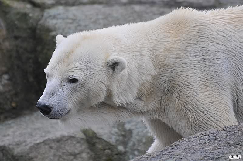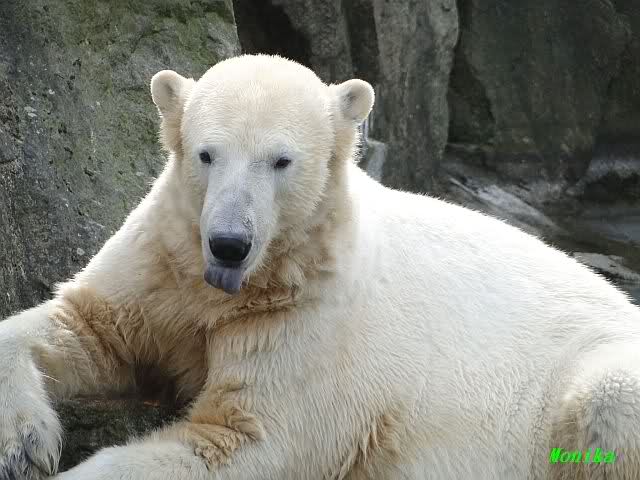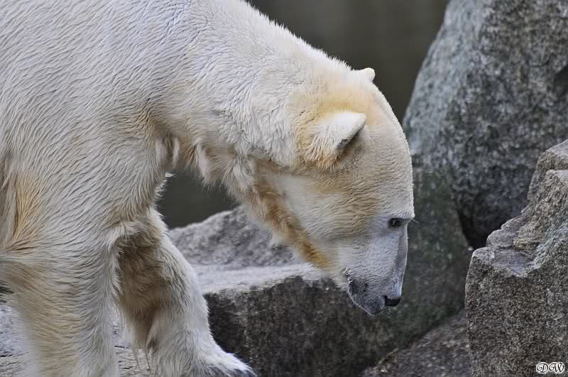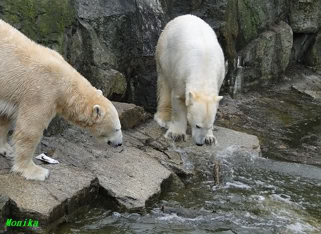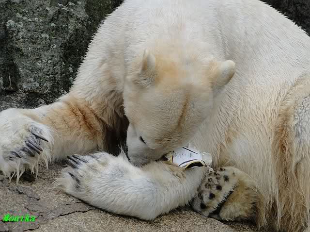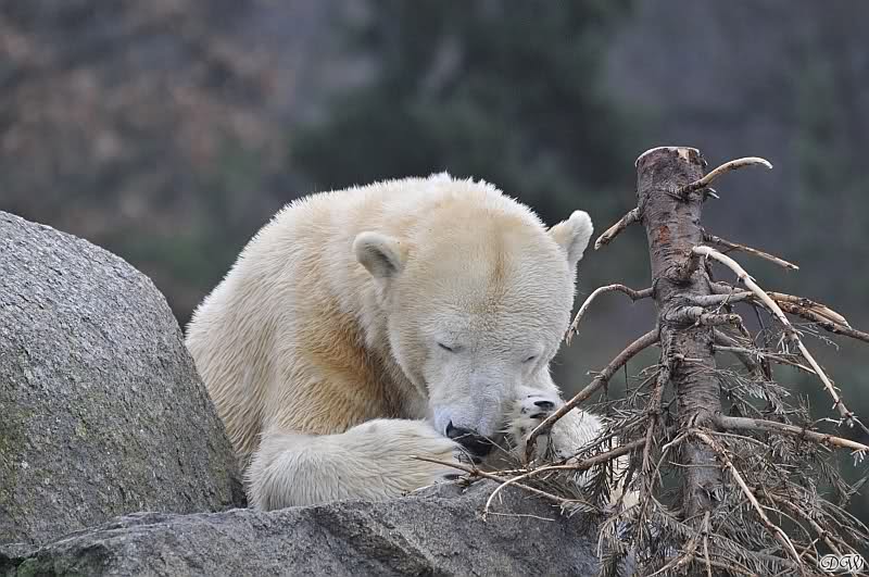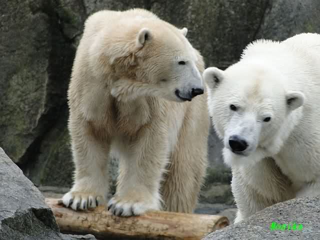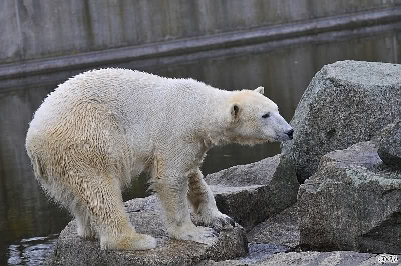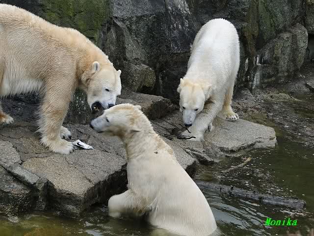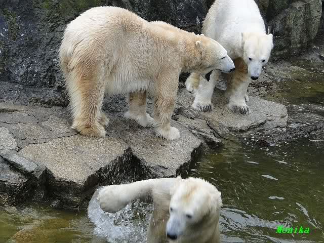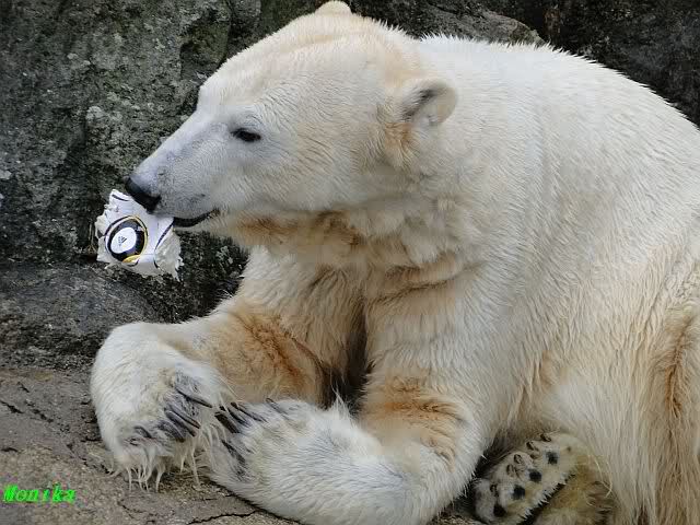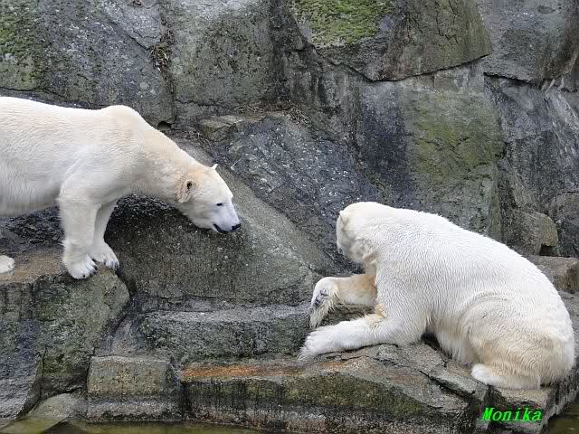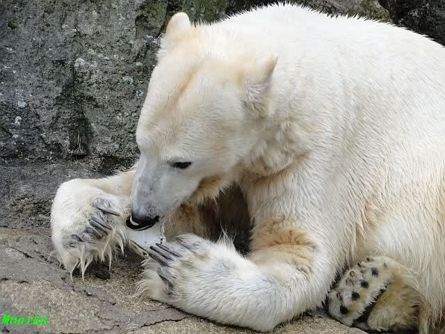 Als Knut einen Spaziergang auf der Anlage unternahm, lauerte Katjuscha schon um ihn zu jagen. Ich stand leider auf der verkehrten Seite und konnte die Beiden nicht sehen. Nur das Brummen war nicht zu überhören. Andere Knutfreunde erzählten mir, dass Nancy sich zwischen Knut und Kati stellte und auch etwas brummte. Kati ist dann gegangen. Das soll sie gestern schon einmal gemacht haben. Siieht ganz so aus, als ob Nancy auch so eine Art "Mutterrolle" für Knut übernommen hat.