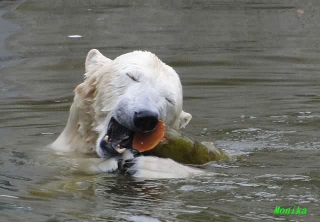 Knut mit Tapirlippchen, da Kati gerade das für ihn bestimmte Stück Fleisch geklaut hat.